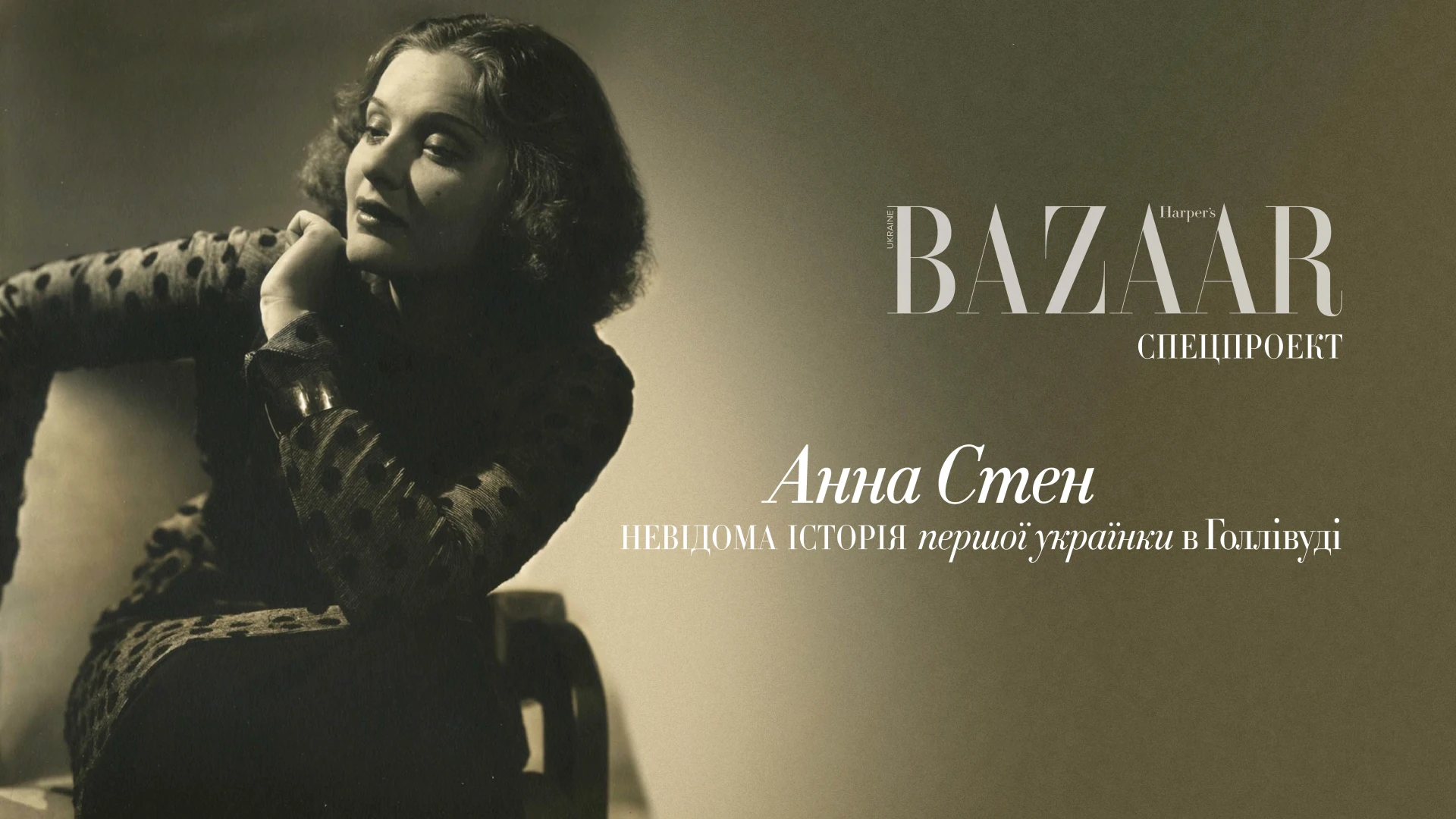 У центрі проєкту Harper’s Bazaar — рідкісне фото Анни Стен від Луші Нельсона, «забутого модерніста». Десятиліттями цей портрет плутали з Марлен Дітріх, а сьогодні він символізує повернення української зірки в історію.