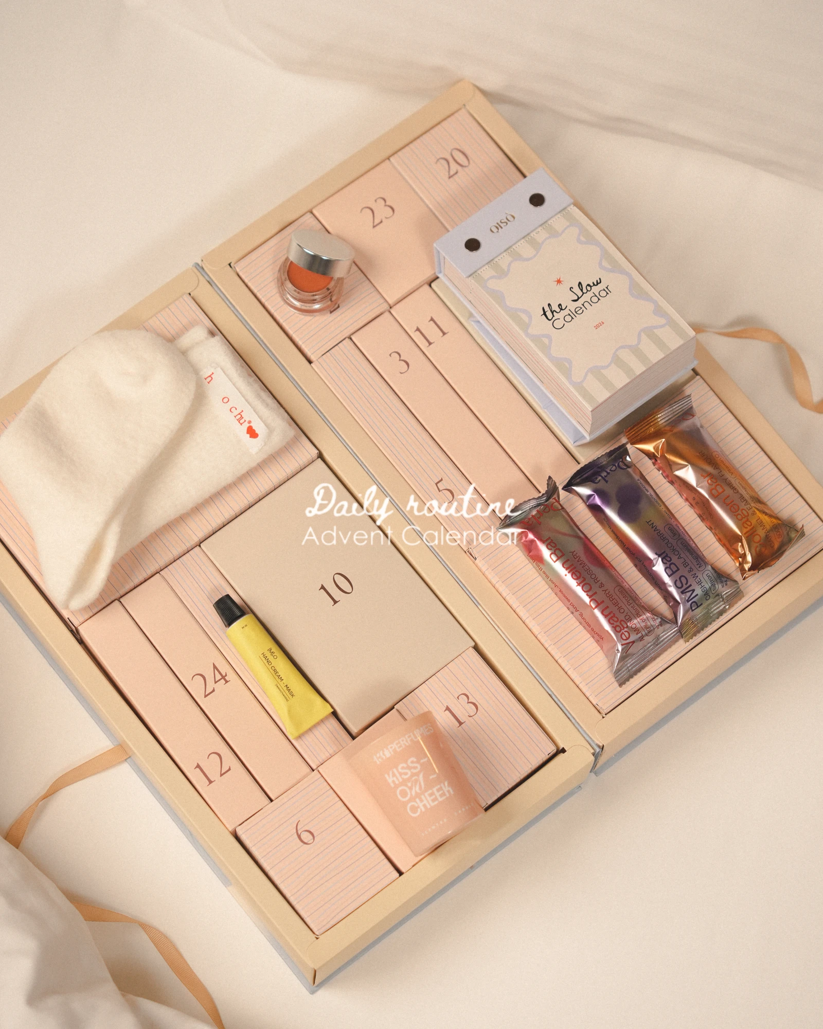 Daily Routine Advent Calendar — це колекція із 26 віконечок «подяки собі», створена шістьма українськими beauty- та wellness-брендами: QISO, 13PERFUMES, UNICO, Hochu, M2O та Perla Helsa. Календар перетворює очікування свята на щоденний, турботливий ритуал, що наповнює кінець року теплом і турботою про себе. Колекція зібрала справжні must-have сезону: настільний календар The Slow, щоб зупинятися й помічати всі деталі життя, відновлювальну крем-маску для рук M2O, охолоджувальний ролер для зони навколо очей, універсальний мультитаскер UNICO (3 в 1) та стильну косметичку, парфумерію 13PERFUMES і функціональні косметичні добавки Perla Helsa. Кожне віконечко дарує відчуття дитячої цікавості, де завжди є новий елемент для щоденних ритуалів. Це ідеальний подарунок, що надихає дозволити собі щоденну насолоду й турботу, щоб зустріти новий, 2026 рік із сяйвом.
