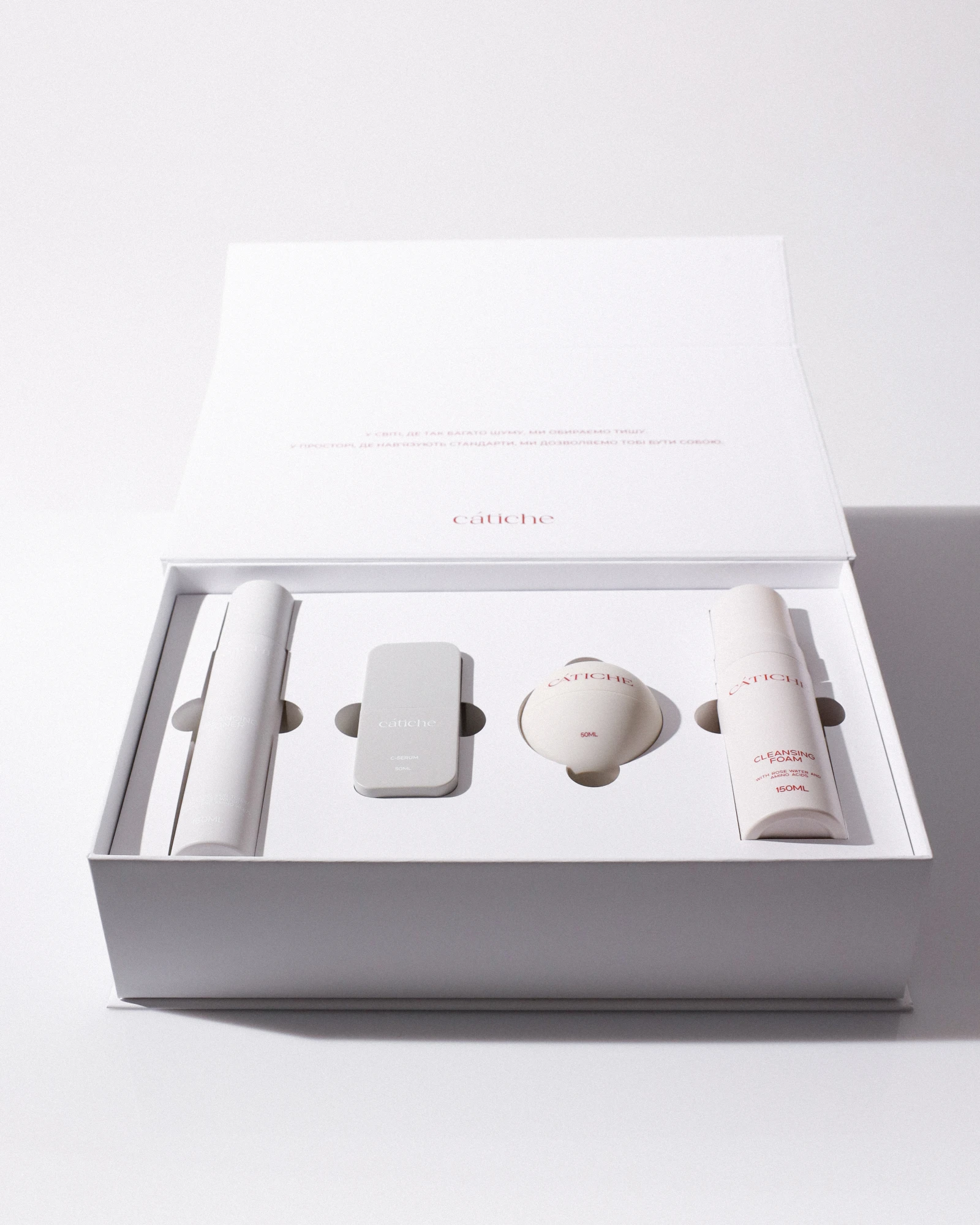 Команда українського бренду CÁTICHE також представила подарункові бокси, створені для знайомства з брендом і формування цілісної, продуманої рутини догляду. Є два варіанти Discovery Box. Один із легким щоденним сонцезахисним кремом CÁTICHE Natural Glow SPF30 — це базовий набір з легкими текстурами, натуральними компонентами та щоденним захистом з м’яким сяйвом. Другий — із сироваткою CÁTICHE C-Serum — пропонує інтенсивніший підхід: інкапсульований вітамін С у поєднанні з активними компонентами працює на освітлення, вирівнювання тону та підтримку пружності. Обидва набори створені за принципом логічної рутини, що складається з очищення, тонізації, активної фази й захисту. Така структура дозволяє легко сформувати стабільний щоденний догляд уже з перших днів використання і робить бокси універсальним подарунком до новорічних свят або зимового self-care. Окрім двох б’юті-засобів, які можна варіювати, у боксі також є: