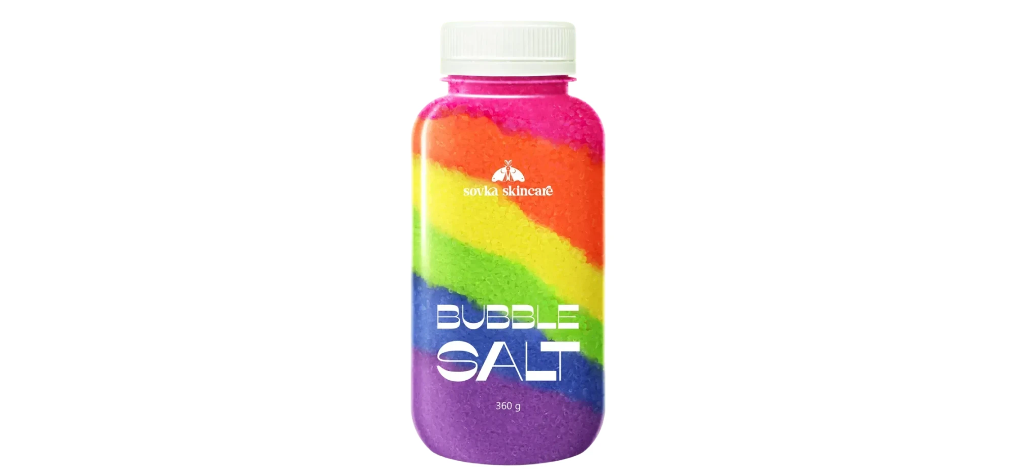 Кольорова сіль для ванни Bubble Salt Fruit Rainbow українського бренду Sovka Skincare забарвлює воду в яскраві відтінки, м’яко піниться й наповнює ванну солодким ароматом. Запах нагадує щось між джемом і льодяниками — веселий і по-літньому теплий. Морська сіль у складі допомагає розслабити м’язи та зробити купання ще більш приємним.