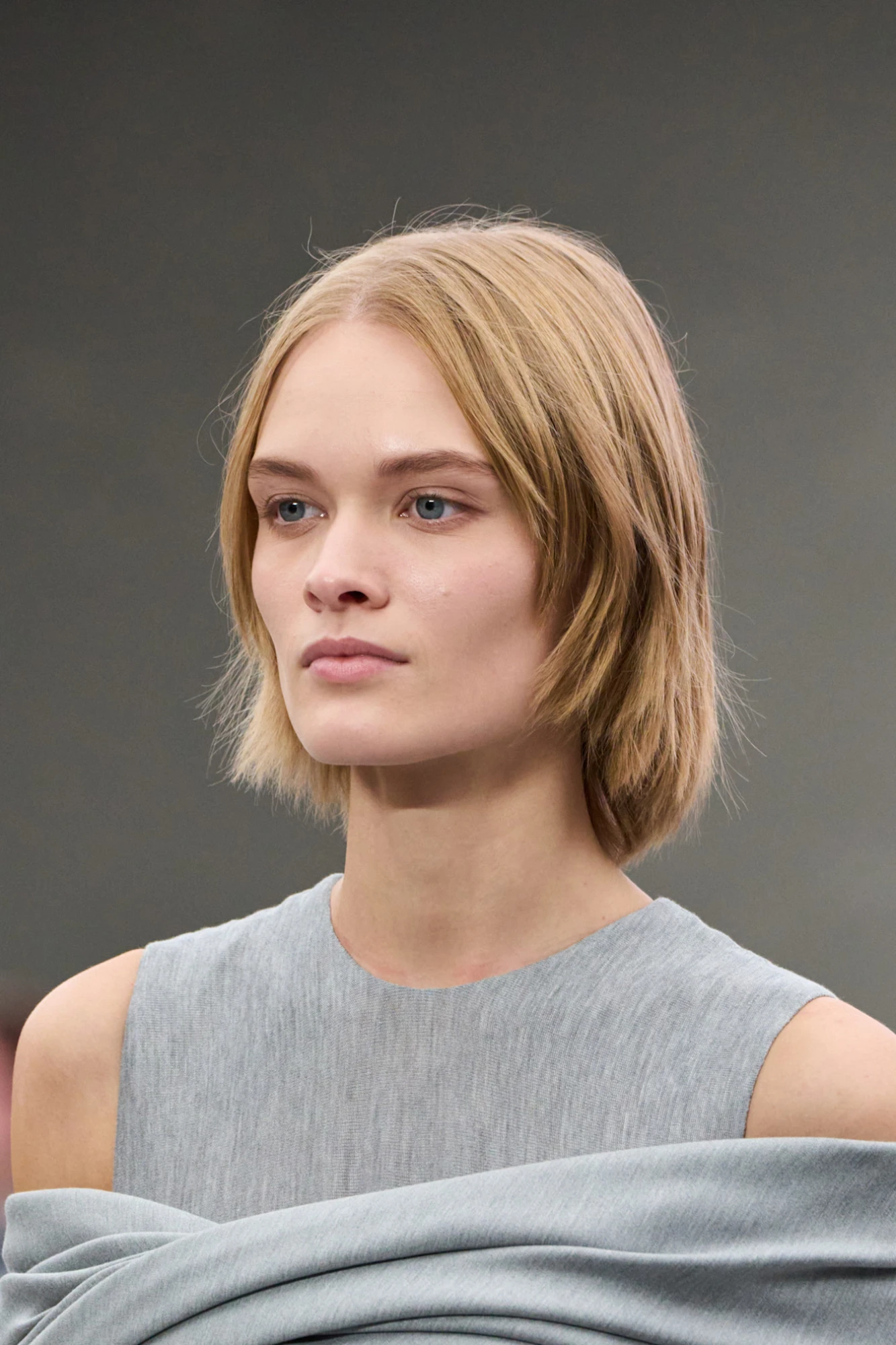 Боб цього сезону відходить від надмірної графічності. Укладки залишають текстуру живою, працюють з природним об’ємом і не перевантажують блиском. Навіть чіткий зріз подають більш рухливо.