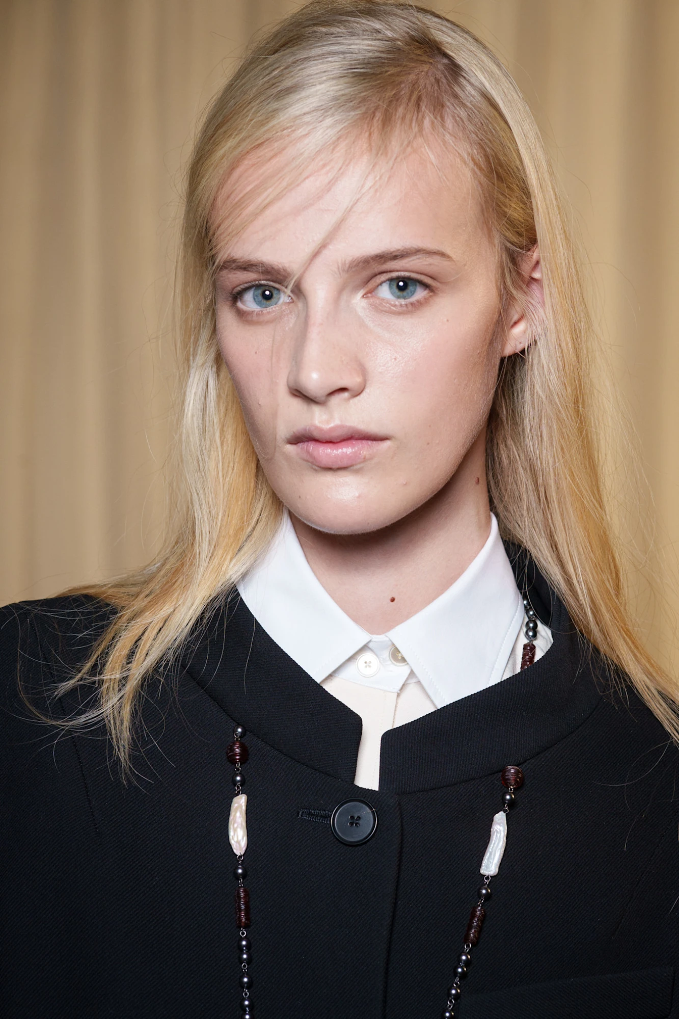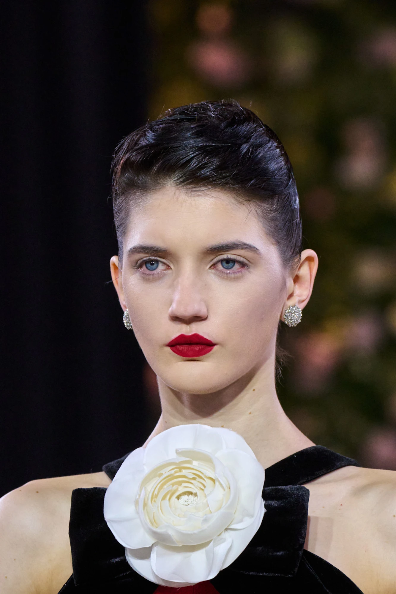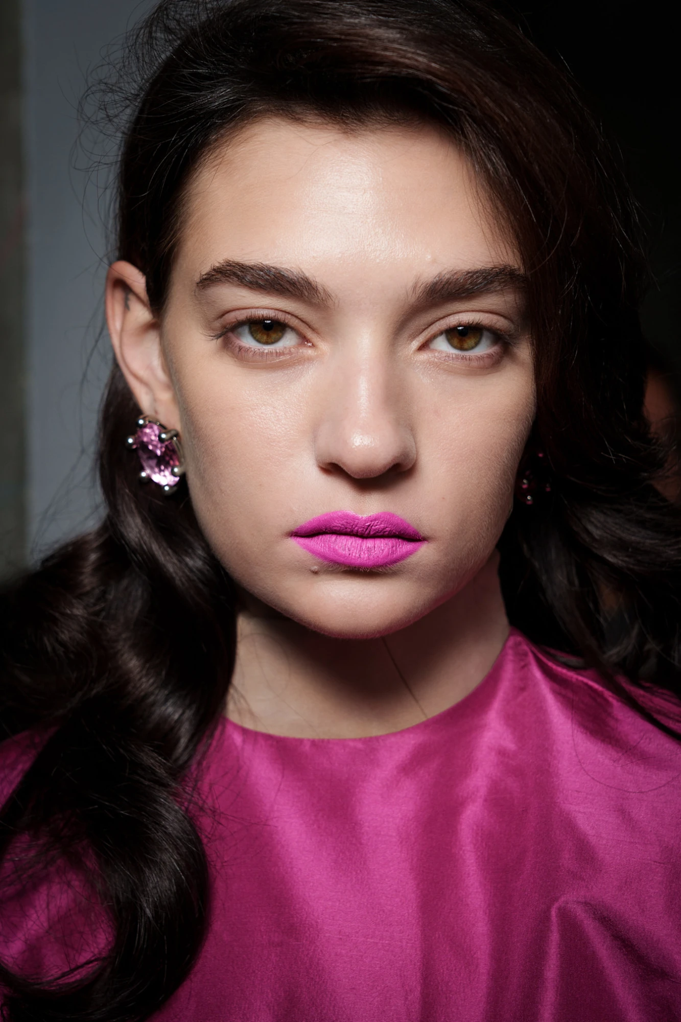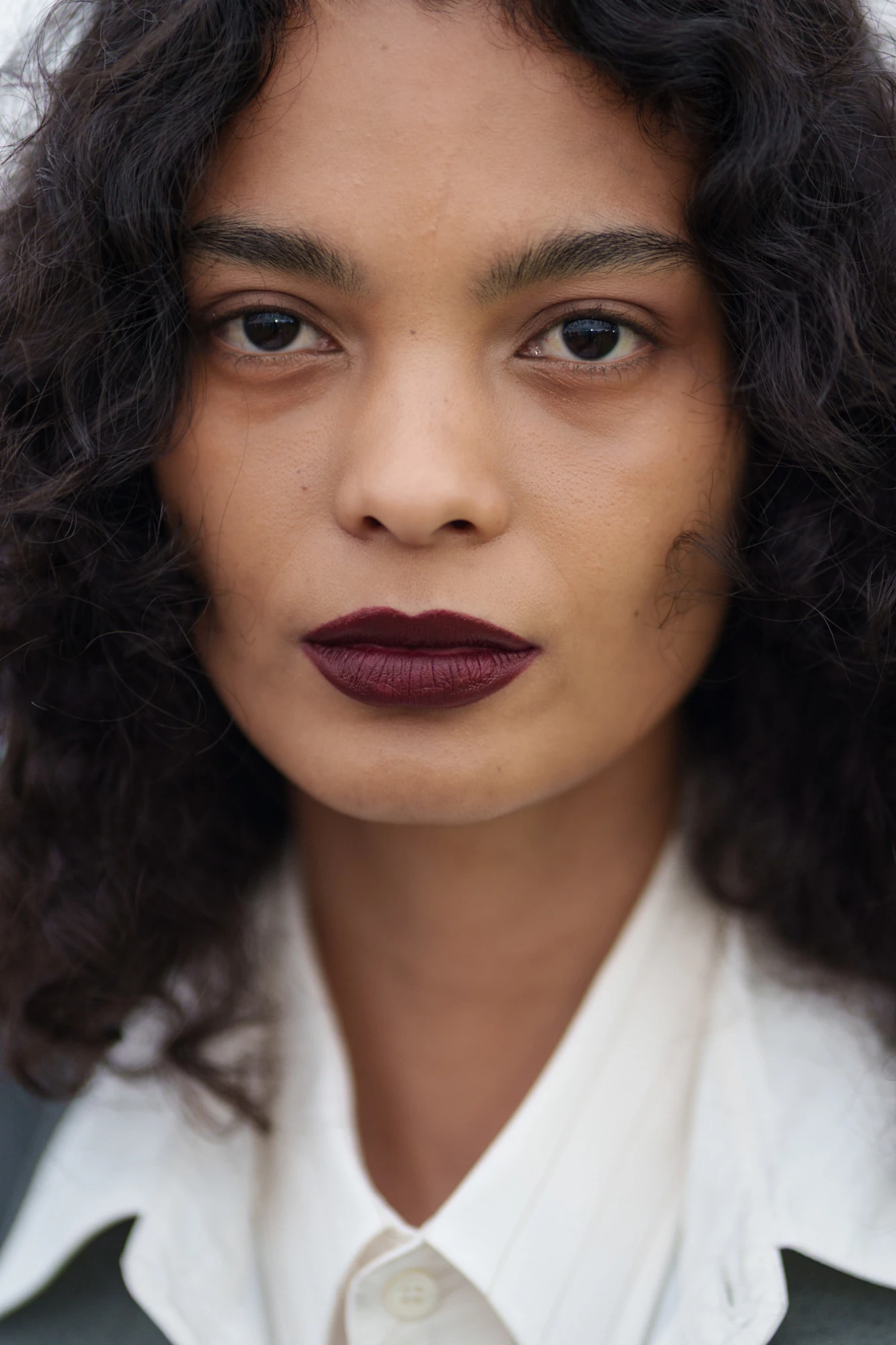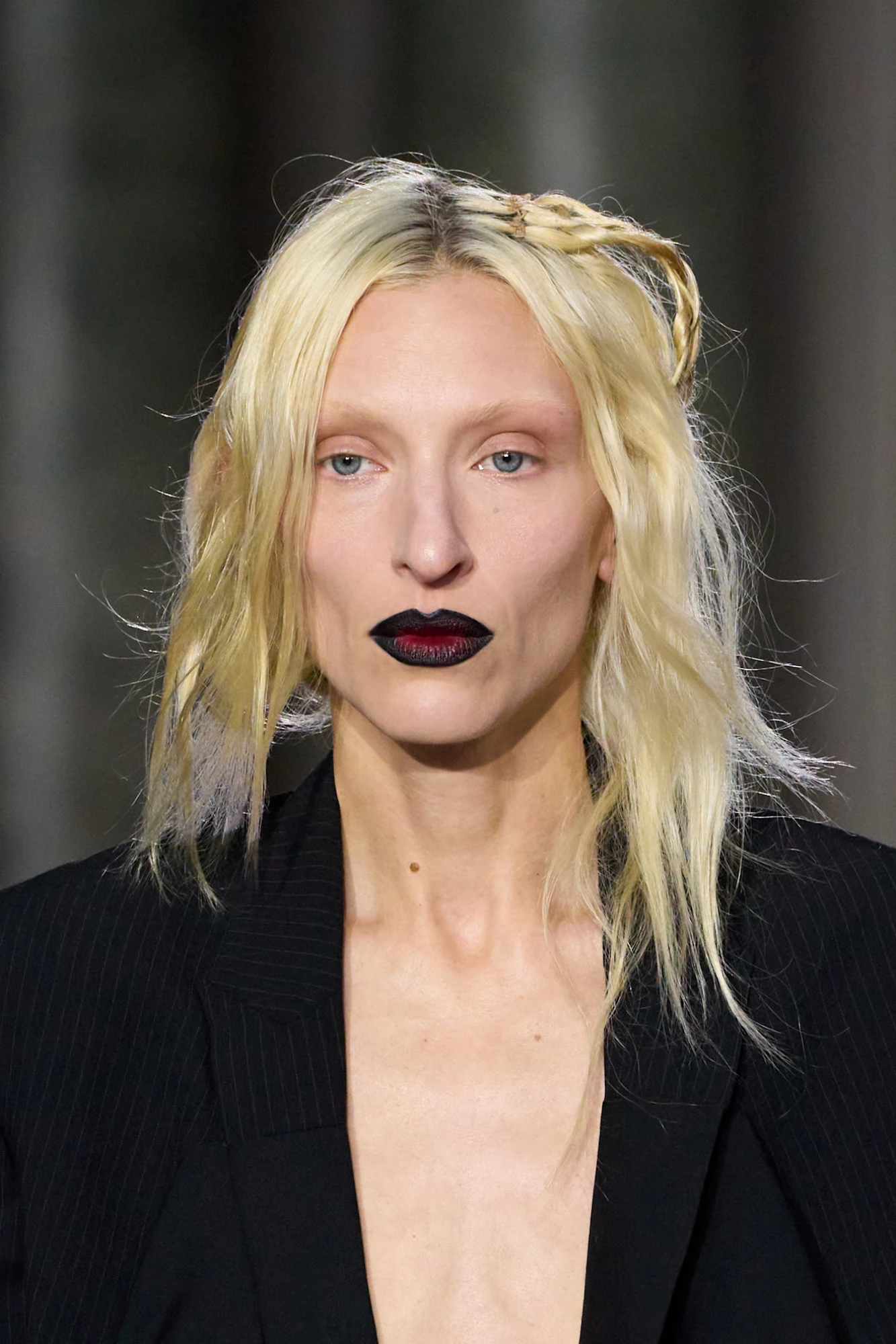 Тренд на губи кольору темних вин зародився ще минулого літа, пережив осінь і зиму та без паузи переходить у сезон весна-літо — 2026. У нових колекціях він не спрощується, а, навпаки, ускладнюється: до щільного пігменту додається виразний контур, часто темніший за саму помаду. Саме такий прийом — контур у глибокому винному або майже чорному відтінку — був помічений на показі Torisheju, де губи стали ключовим драматичним акцентом образу.