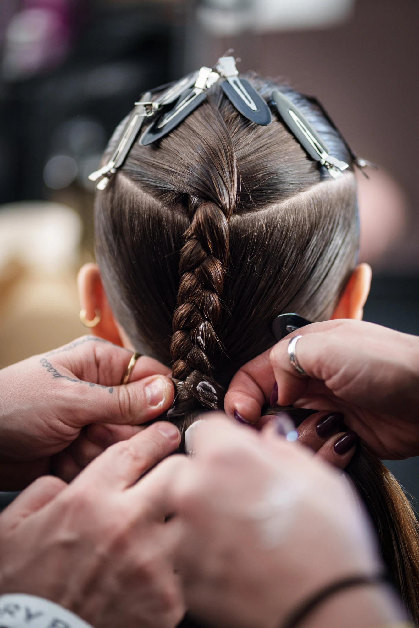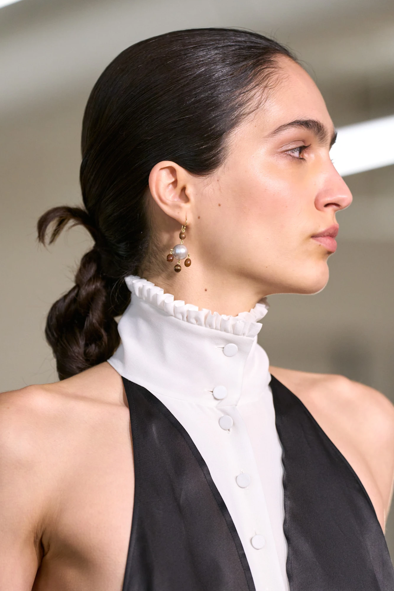 Гладкий, майже «залізаний» фініш врівноважував силуети з відсиланням до 1920-х і робив їх більш сучасними. Окрім кіс, на подіумі з’являлися й низькі гладкі пучки, однак саме сегментоване плетіння стало головним б’юті-акцентом показу.
