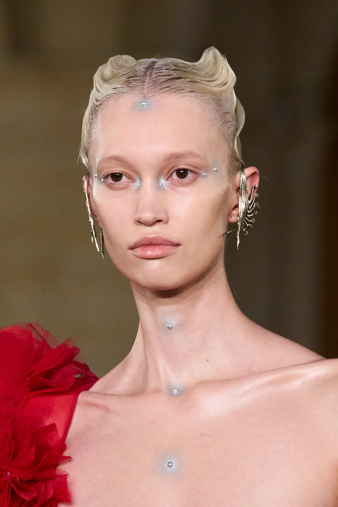 Один із найцікавіших прийомів макіяжу шоу — змішування рідкого хайлайтера з пігментами, що дають металеве або перламутрове світіння. Саме це зробило сяйво глибшим і багатовимірним: замість одного фіксованого відтінку шкіра змінювала колір на світлі.
