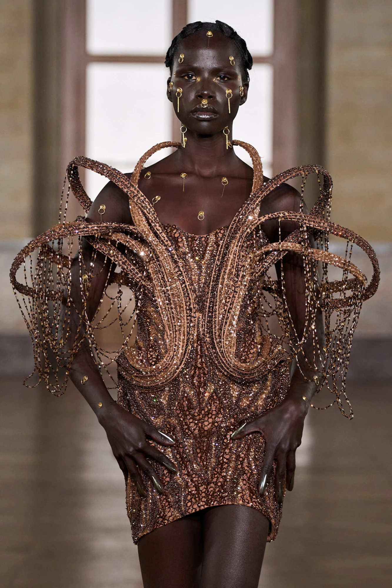 Загалом б’юті-естетика шоу Gaurav Gupta продовжила ключову ідею колекції: тіло як простір для енергії, світла й трансформації. Макіяж і зачіски тут не відокремлювалися від кутюру, а працювали з ним як єдиний художній жест — на перетині моди, духовності та майже театрального перформансу.