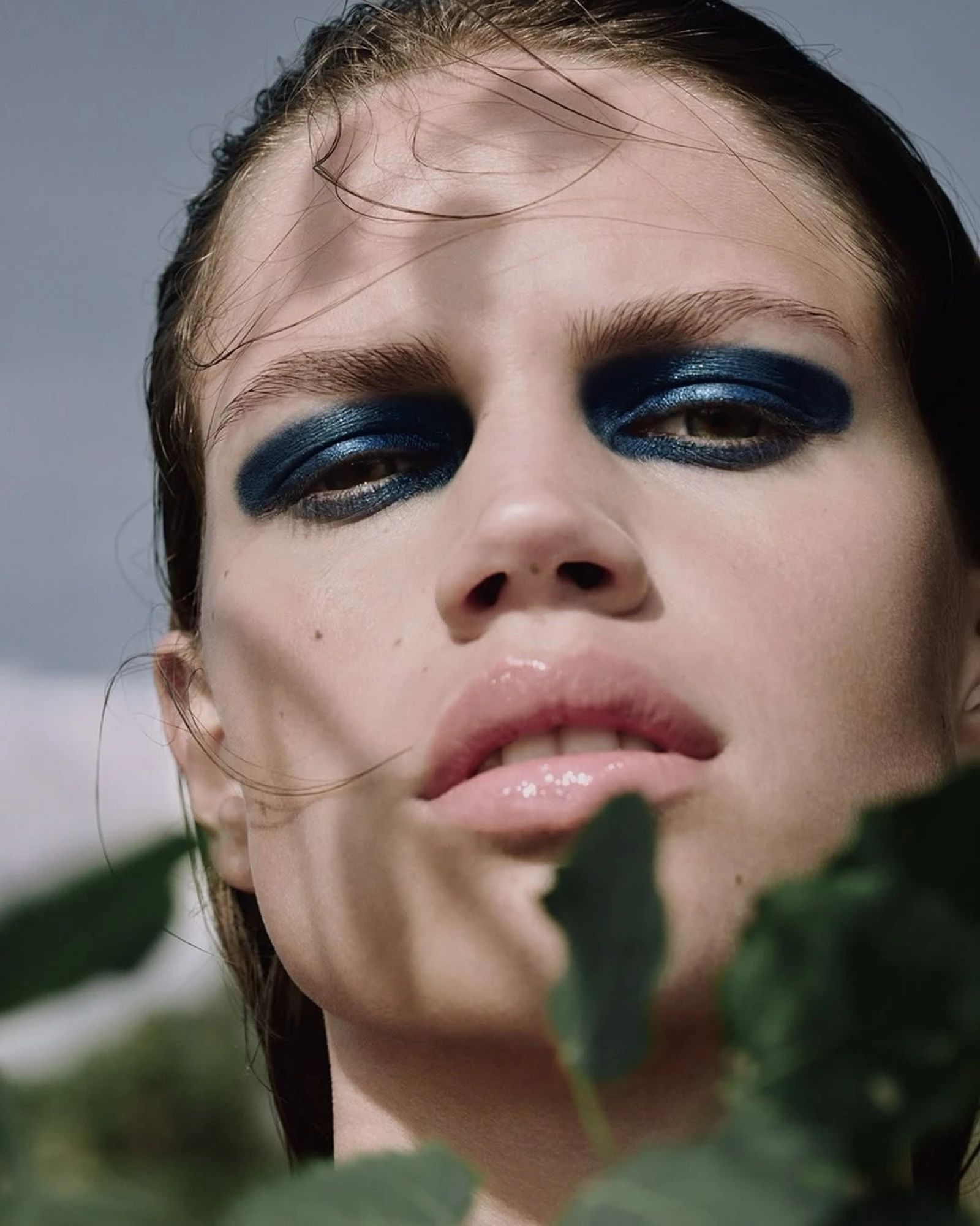 Якщо у 70-х це була яскрава матова пудра до брів, то тепер — напівпрозорий серпанок кольору неба, глянцева текстура чи кремові формули, що нагадують про морські відблиски на шкірі. Втім, якщо хочеться яскравої драми, зверніть увагу на роботи візажистки Лючиї Піки для бренду Byredo Beauty. Або Виолетти Серри, креативної директорки по макияжу Guerlain. Саме вони задають нові правила гри для кобальтового синього кольору на повіках.