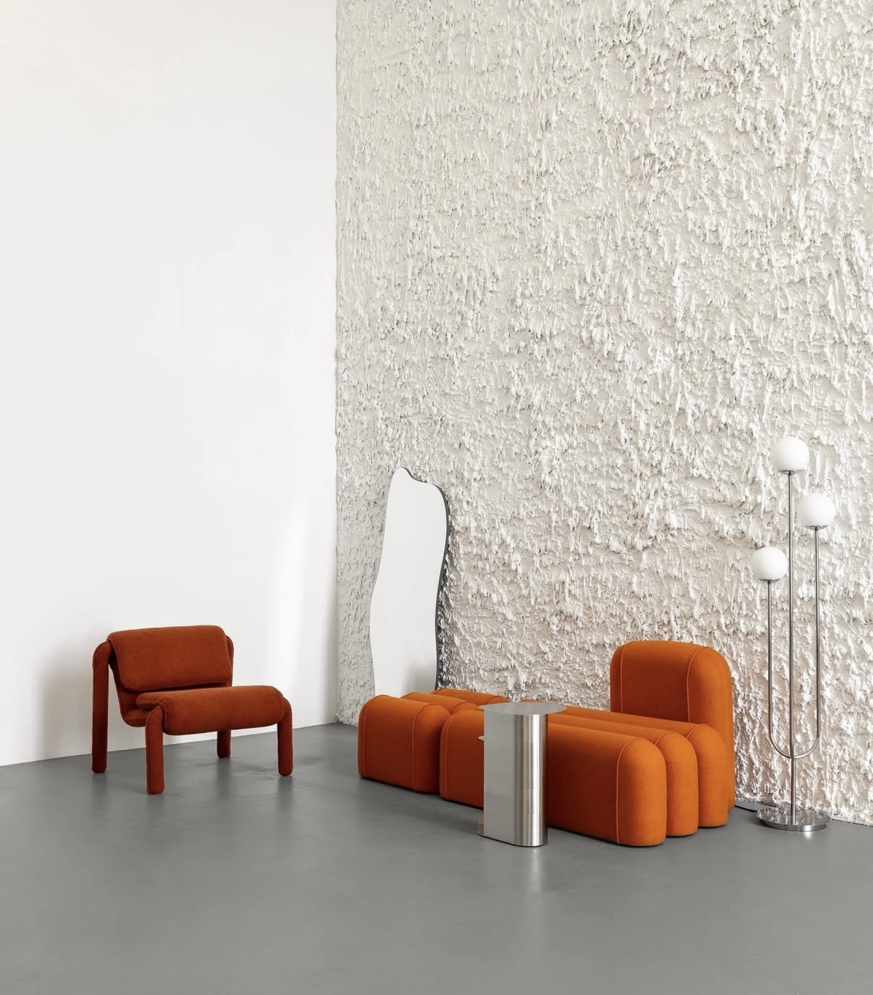 Скульптурна геометрія з циліндрів і куль, що миттєво збирає композицію кімнати; доступна широка кастомізація тканин і ніжок.