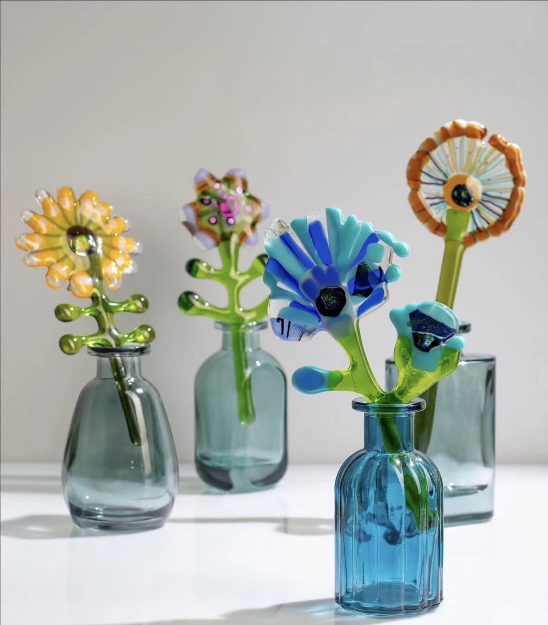Авторська ф’юзинг-техніка: вази, тарелі й невеликі об’єкти, які ловлять світло.