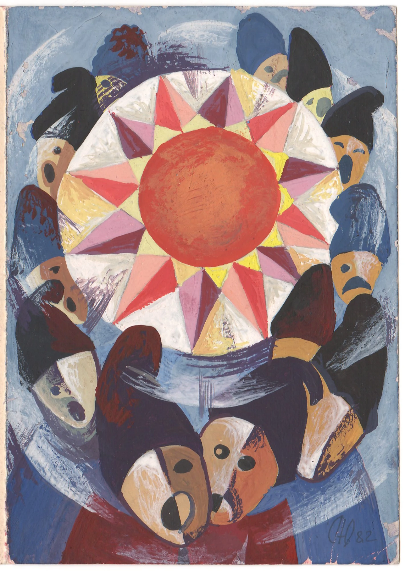 Її композиція побудована навколо образу різдвяної зірки, яку оточують стилізовані обличчя колядників. Вони подані узагальнено, майже маскоподібно, що відсилає до давніх обрядових традицій, де коляда поєднувала спів, рух і елемент гри. Робота передає відчуття хороводу або колективної театралізованої дії. Це символізує єдність громади, спільну радість і циклічність часу.