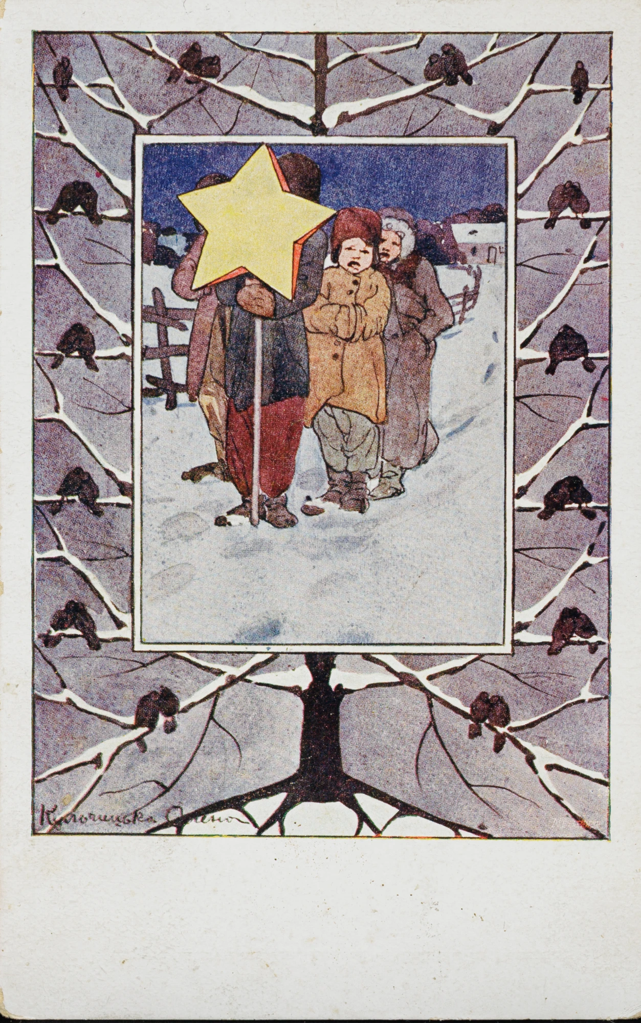 У цій листівці Олени Кульчицької зображено сцену різдвяної коляди. У центрі композиції — група дітей, які йдуть засніженою дорогою й несуть різдвяну зірку — головний символ народження Христа та світла.