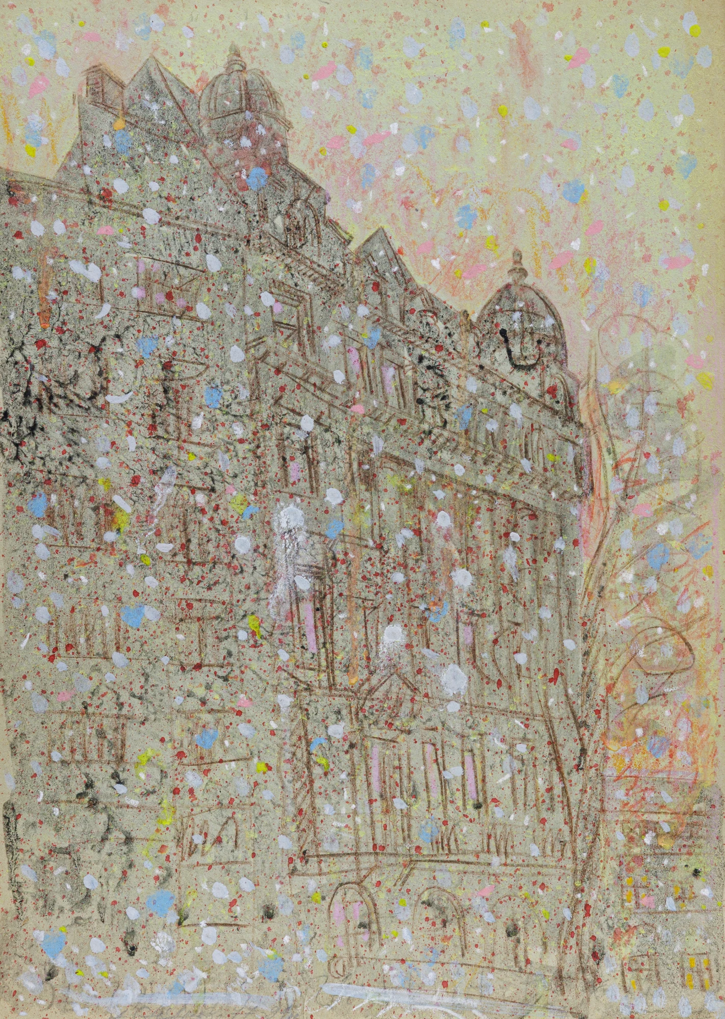Ця зимова робота Степаненка сприймається як образ різдвяного міста. Ефект снігопаду, створений крапками й плямами світлої фарби, нагадує ніч, коли вулиці завмирають і наповнюються світлом та тишею. Пастельні рожеві, блакитні й жовті вкраплення асоціюються зі святковим сяйвом і теплом, яке протиставляється зимовому холоду.