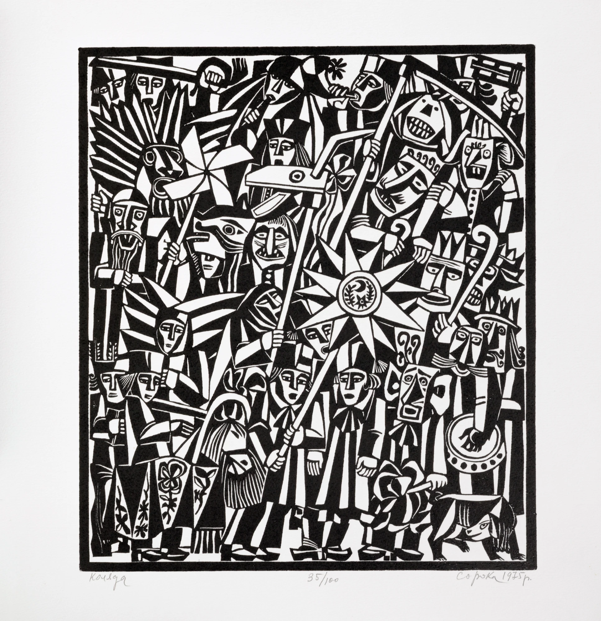 На виставці представили 13 графічних робіт Богдана Сороки, надані його родиною. В основі композиції «Коляди» тема давнього звичаю колядування. Щільна побудова композиції створює образ єдності в публічному святкуванні. Робота наповнена візуальними знаками й символами, впізнаваними для нас.