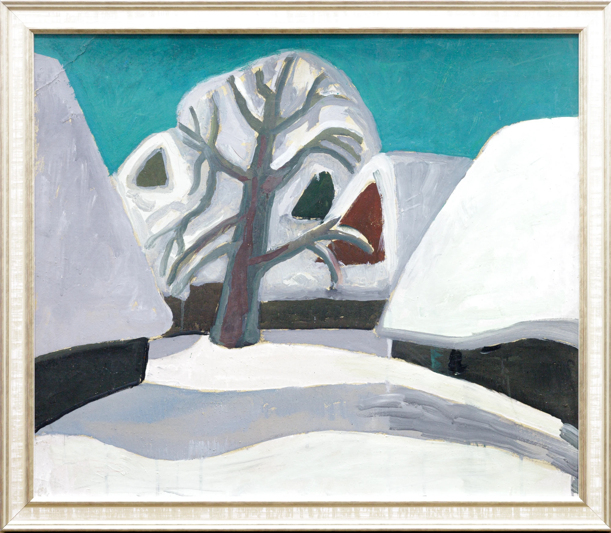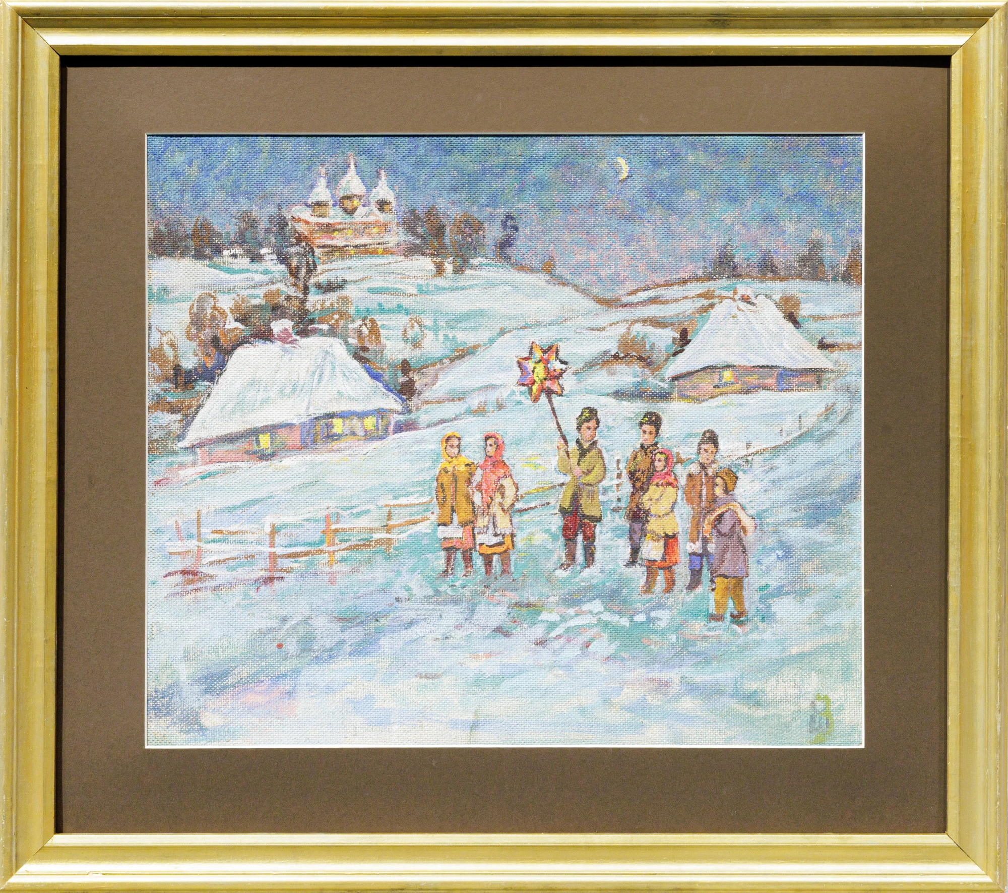 «Зима» — робота, надана з родинної колекції. Це приклад поєднання традиційного пейзажу й модерністичної манери. Старі українські хати не прямо візуально відсилають до Різдва, але навіюють нам спогади, зокрема про святкування в селі. Також це непрямий діалог з глядачем і часом, коли була створена картина, а саме 1960-ті роки, коли Різдво активно «переслідувала» влада.