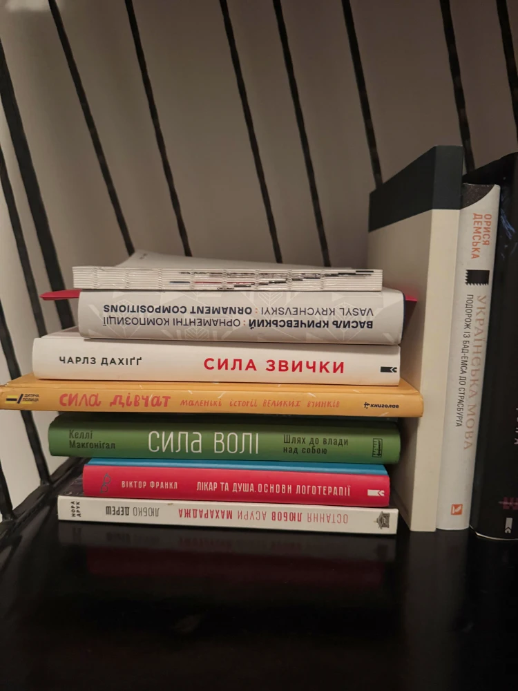 Коли я вчилася в Kyiv-Mohyla Business School (KMBS) мені доводилося дуже багато читати, і є ряд книжок, які я постійно тримаю поруч. Я намагаюся перечитувати таких авторів, як Віктор Франкл, Мирослав Дочинець (чекаю коли знімуть кіно за романом «Криничар» — це надзвичайно захоплива історія). Також, наприклад, книга «Шлях митця» Джулії Кемерон в мене завжди під рукою.