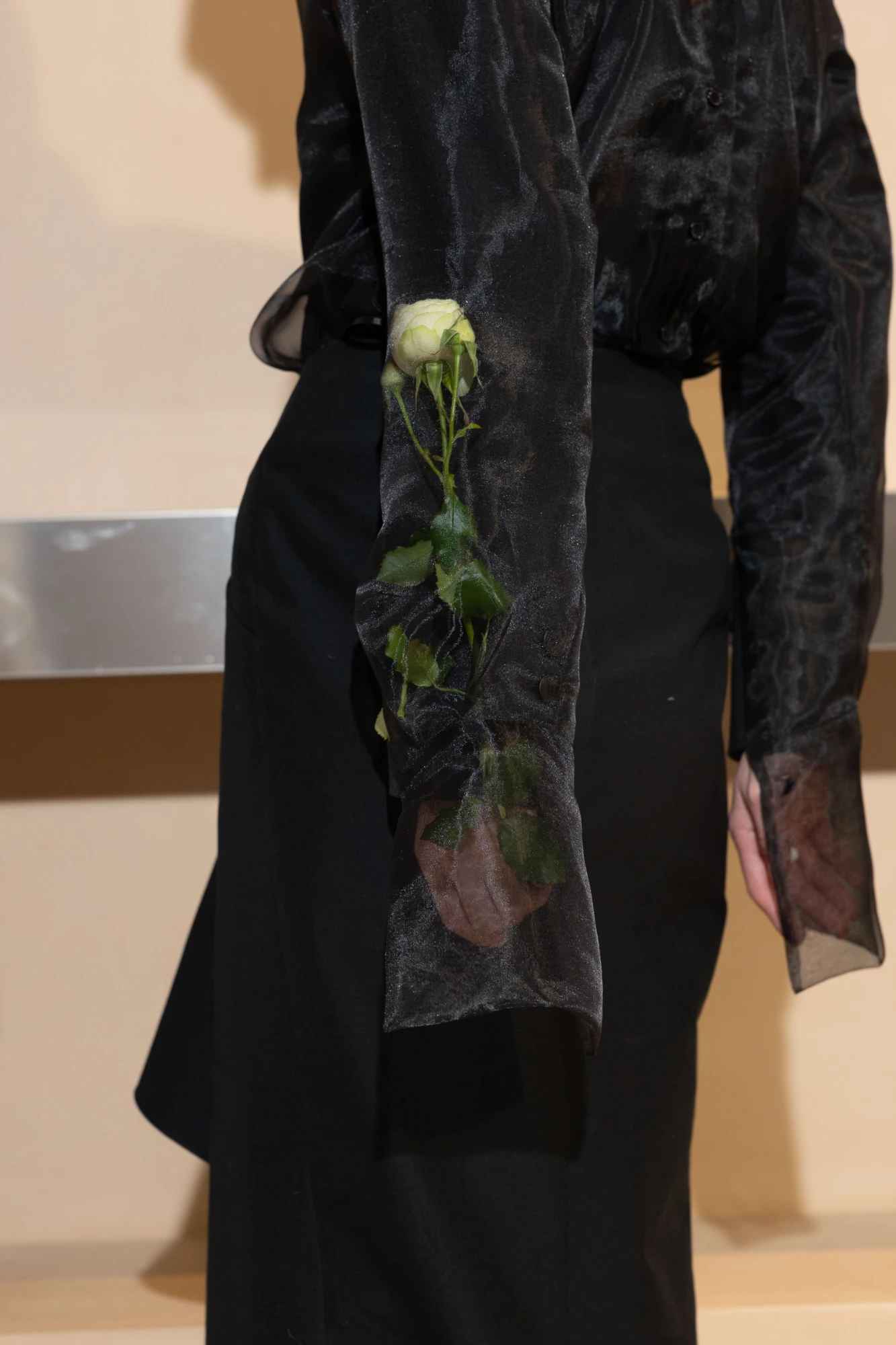 Ми використовували перфоровані деталі, нашиті на тканину як пелюстки квітів, шовк, віскозу, напівпрозорі тканини, органзу та трикотаж. Окремо варто відзначити оксамитові деворе на віскозі та авторські квіткові принти, без яких не буває POUSTOVIT.