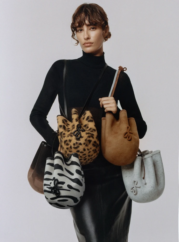 Серед центральних елементів колекції — HatBag, унікальний аксесуар-трансформер, що поєднує функціональність сумки та капелюха. Ruslan Baginskiy додає до лінійки також нові форми, зокрема айві-кеп — силует, що балансує між класикою та сьогоденням.