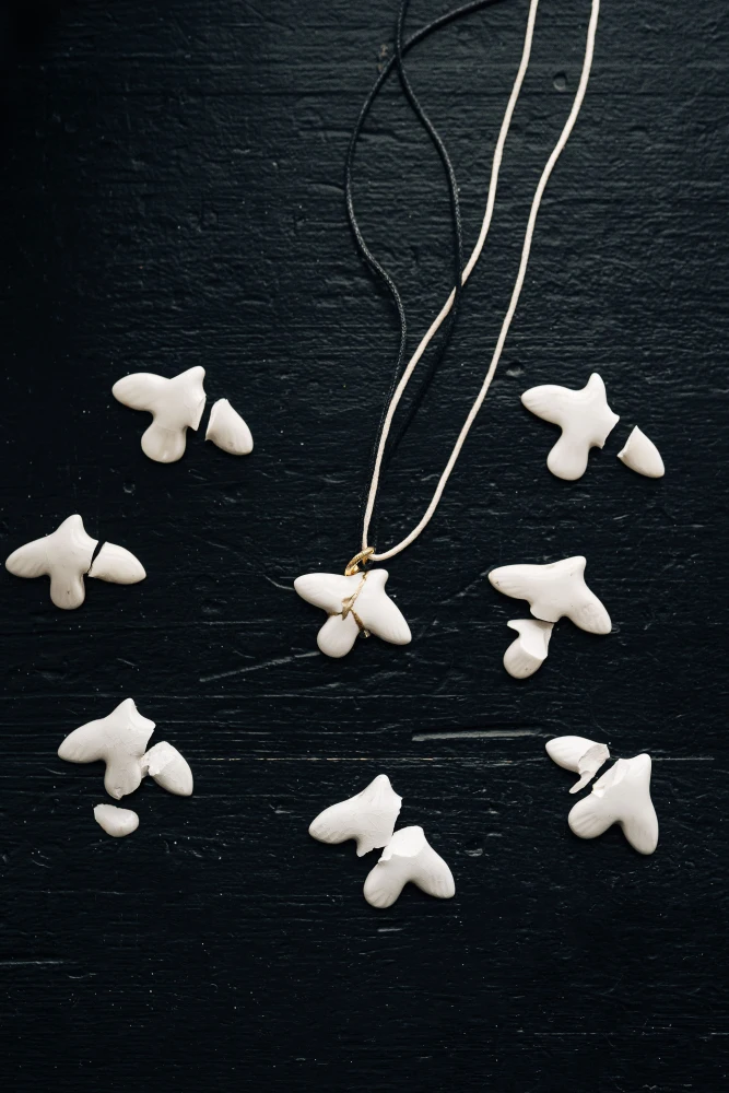 Прикраса «Краса, що пам'ятає» — це керамічна пташка, розбита й заново зібрана у традиційній японській техніці реставрації кінцуґі. 50% від її вартості передаватимуть до програми «Неопалимі» на лікування і реабілітацію людей з травмами, здобутими внаслідок війни, — опіками та рубцями.