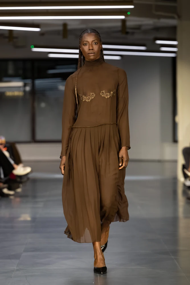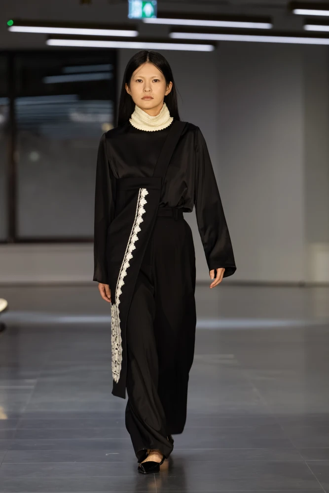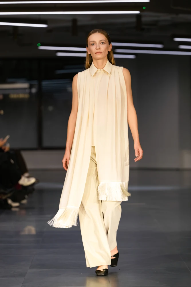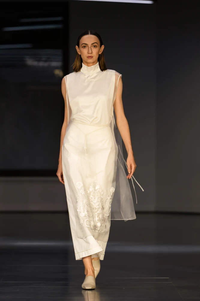 «Тиша часу» — простір, де швидкоплинність світу стишується і залишається лише відчуття глибини. Символічно саундтреком показу став шум майстерні: клацання голки, подих тканини і ритм ножиць. Цей звук — відлуння колективної пам’яті, де зшивається спільне майбутнє.