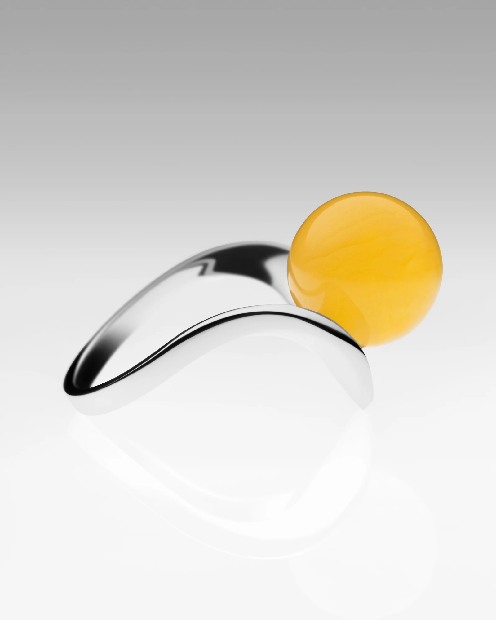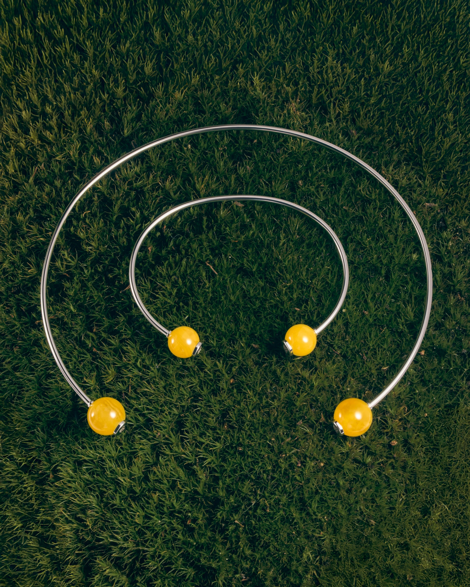 Бурштин у колекції TERRA виглядає несподівано: замість звичних форм — сферичні намистини насиченого жовтого кольору, замість золота теплого відтінку — білий метал. Деякі моделі оздоблені діамантами, що створюють ефект світлової гри.
