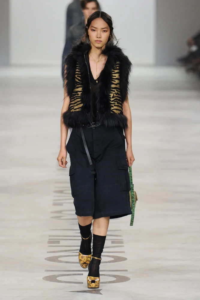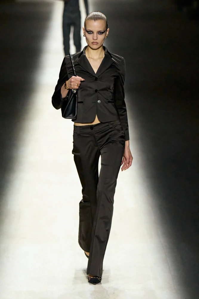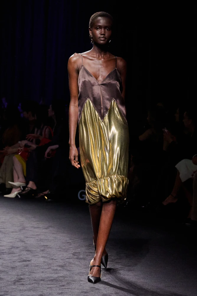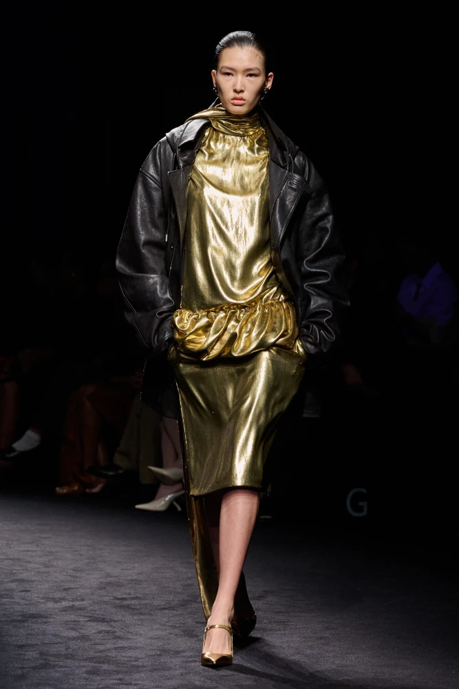 Демна у своїй новій колекції Gucci повертається до епохи кінця 1990-х — початку 2000-х років, коли Дім очолював Том Форд. Новий креативний директор презентує обтислі шкіряні куртки, брюки й футболки, вузькі джинси, сліпуче-білі мінісукні та мерехтливі максі.