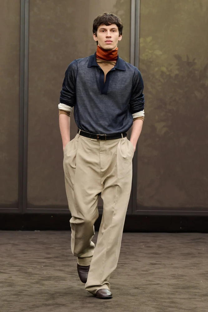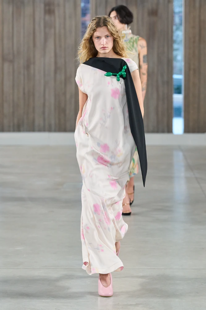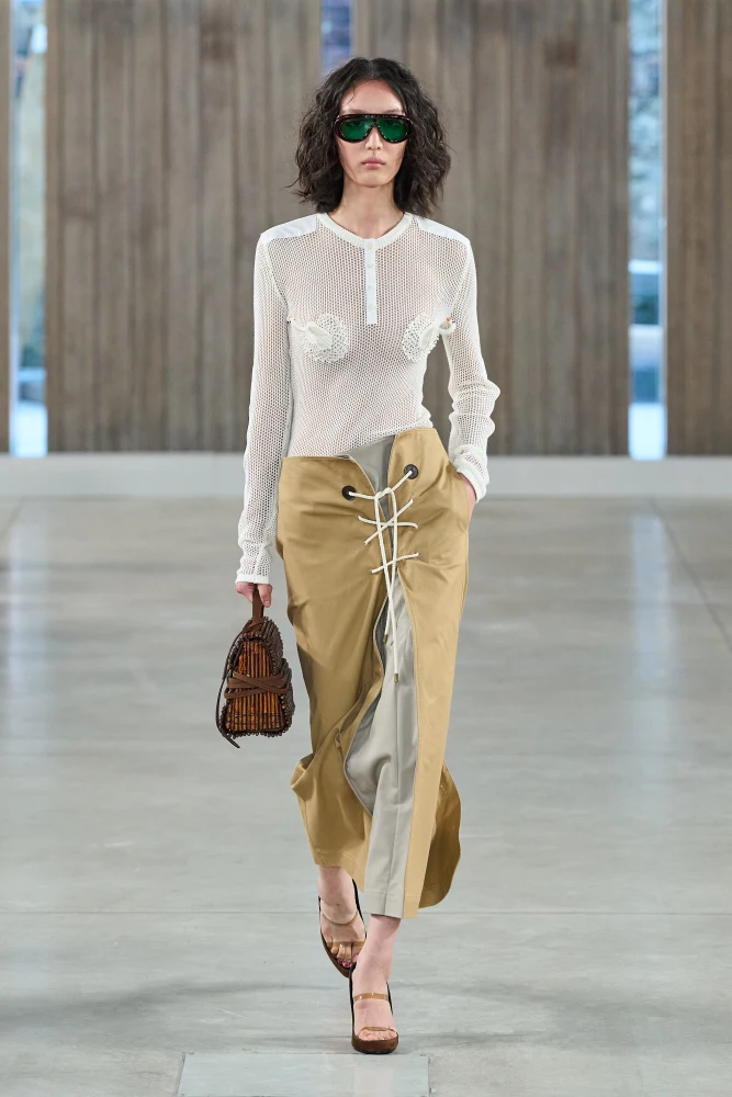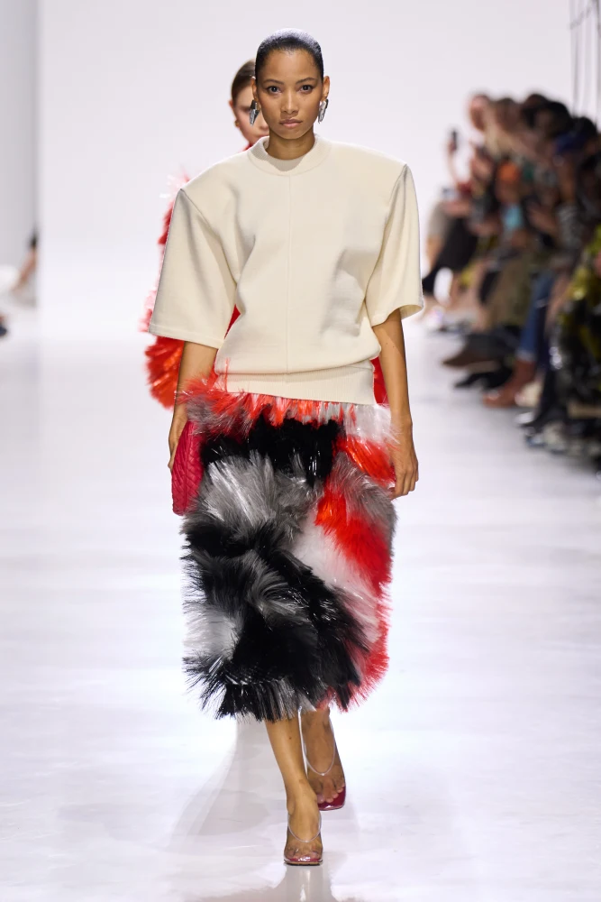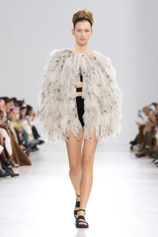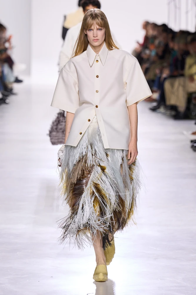 Вивівши свої дизайни на вперше за довгий час залитий сонячним світлом подіум Bottega, Луїз Троттер розкрила потенціал фірмового плетіння бренду на максимум. Саме intrecciato отримало провідне місце у її дебютній лінійці, з’явившись на оздоблених пір’ям пальтах, приталених скульптурних топах, а також комірах об’ємних тренчів і курток.
