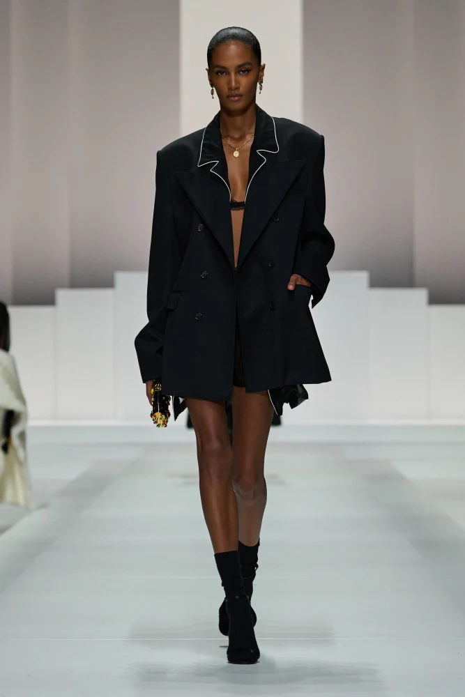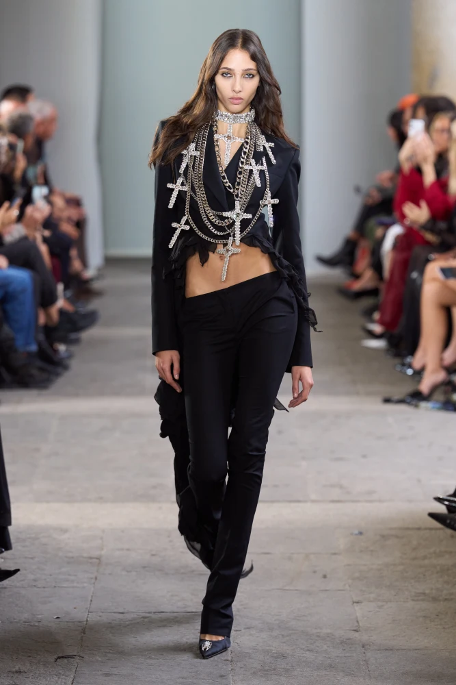 Цього сезону Даріо Вітале переосмислює один із ключових кодів Дому — сексуальність. У його прочитанні вона м’якша, розслабленіша, тож розшитий лелітками бра-топ і металізована спідниця доповнюються пов’язаним на талію трикотажним кардиганом.