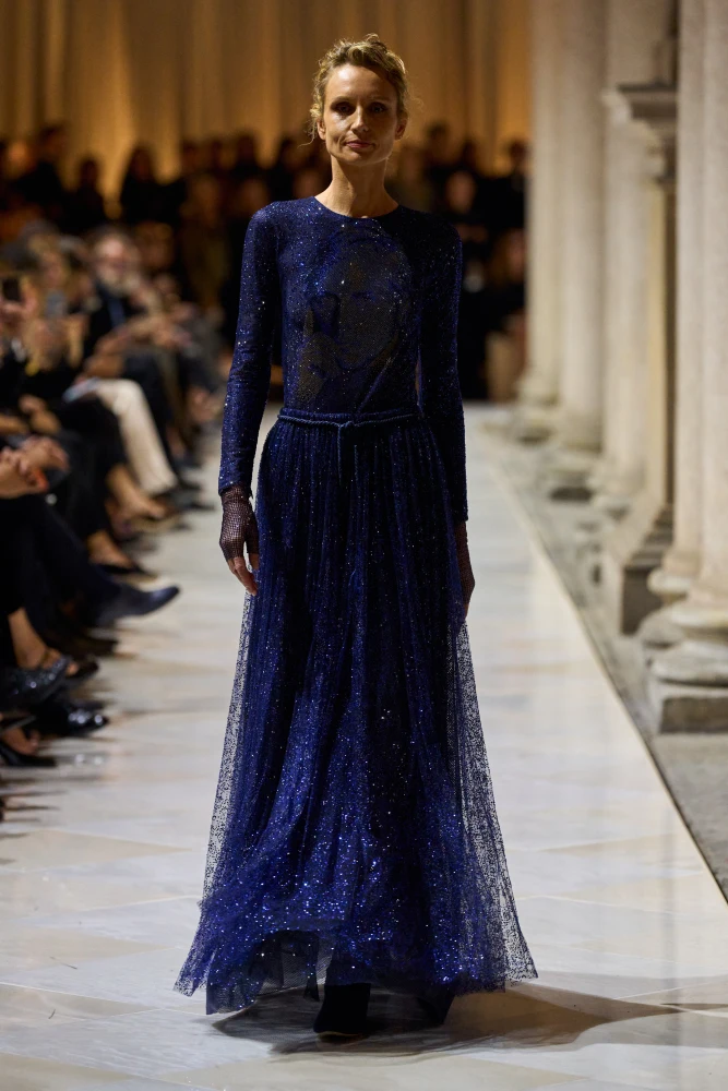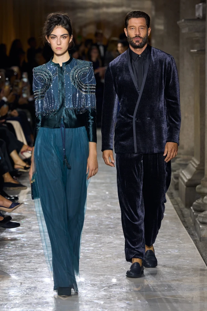Показ відбувся у пінакотеці Брера — саме тут, серед робіт Караваджо та Боттічеллі світ побачили останні 150 образів від самого Армані. Деякі з моделей дефілювали парами, показуючи зв’язок фемінності й маскулінності, інші ж самостійно демонстрували блискучу шовкову фактуру, тактильний оксамит, насичені сині відтінки, майстерну вишивку, повітряні елементи й глибокі V-подібні вирізи.