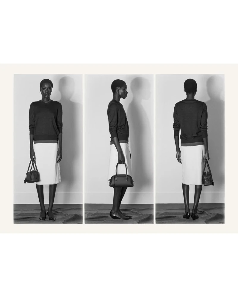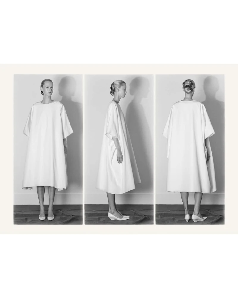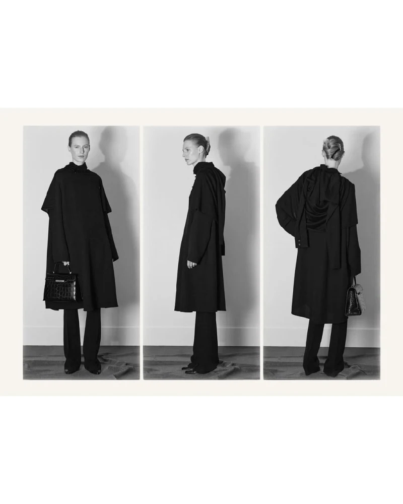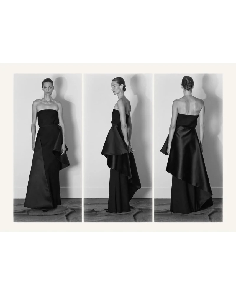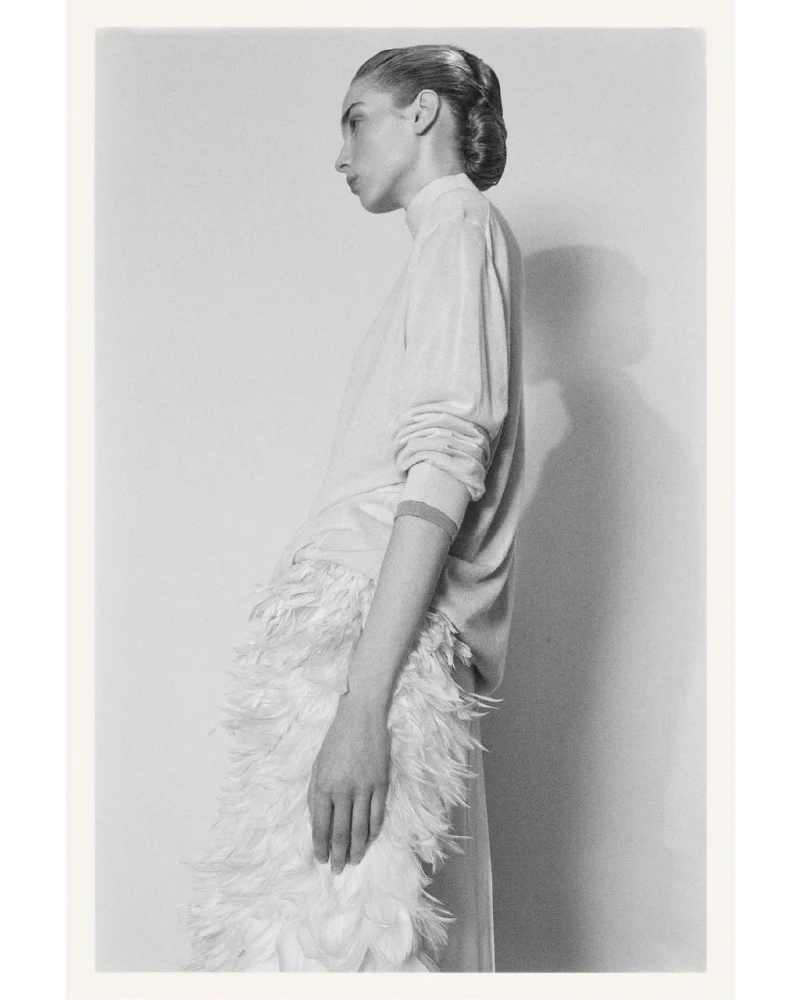 Фільмувати представлену на приватній презентації колекцію The Row традиційно було заборонено, тож, як і завжди, нова лінійка бренду опинилася у центрі уваги щойно її фото були опубліковані. І цього разу це була серія чорно-білих світлин, на яких одяг лишається мінімалістичним і водночас набуває оздоблення у формі драпірування, пір’яного декору і фактурних контрастів.
