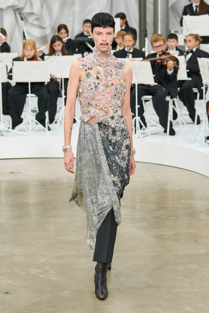 Матьє переосмислив Chanel не лише через архіви, а й через діалог із Габріель Шанель, через любов. Сама ж колекція складалася з трьох розділів: «Парадокс», «День» та «Універсальне». Перший був натхнений архівними фото Коко Шанель, на яких вона позувала у чоловічих сорочках свого коханого Артура Кейпела. Другий демонстрував класичний для Chanel денний одяг, що тепер проживає історію разом із тілом. Третій же — про універсальність Дому, про свободу і безмежне поєднання стилів.