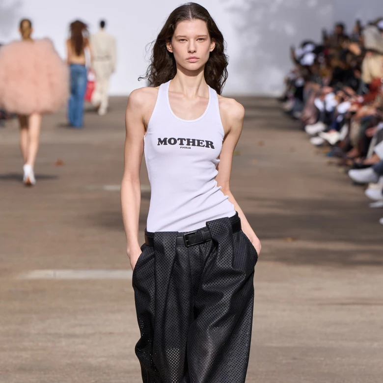 Графічний топманіфест був представлений і у самій колекції Stella McCartney — модель Mother F*cker, що стала справжньою зіркою показу. Серед знаменитостей виріб уже встигла приміряти Дуа Ліпа.