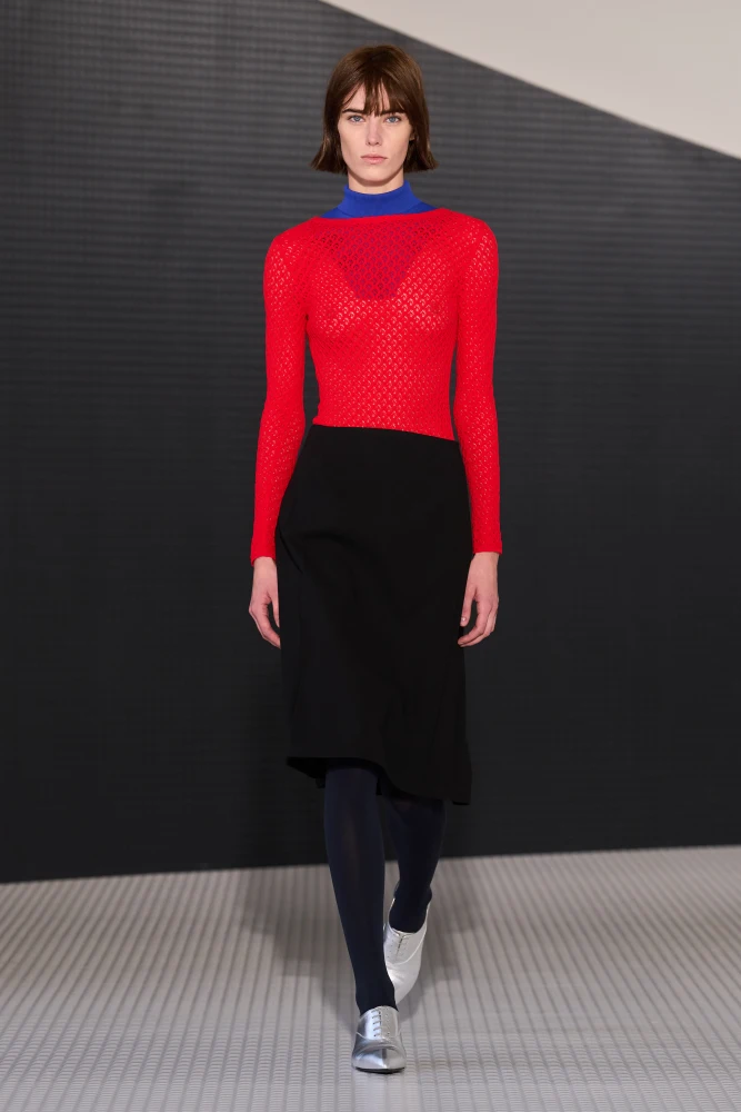 Balenciaga доповнив рожеву футболку червоною statement-спідницею, а Fendi обрав футболку насиченішого рожевого кольору для аутфіту з червоними шкіряними брюками. Ніжний рожевий фартух, що став знаковим елементом у колекції, Miu Miu комбінує з червоною сумкою та окулярами, створюючи баланс за допомогою сірого светра і чорних рюшів.