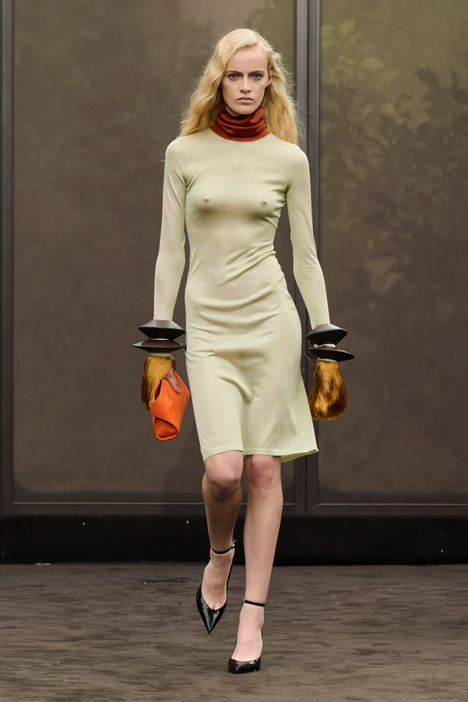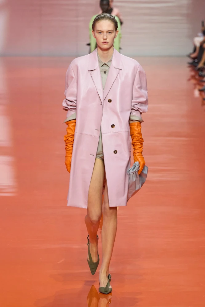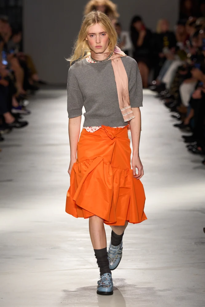 N°21 використовує сірий у портретній зоні, зміщуючи помаранчевий униз. Miu Miu — додає помаранчевий у вигляді сумки, що завершує аутфіт із сірою мінісукнею з рюшами. Зрештою, такі образи також бачимо у Prada — помаранчевий і сірий зустрічаються в аксесуарах.