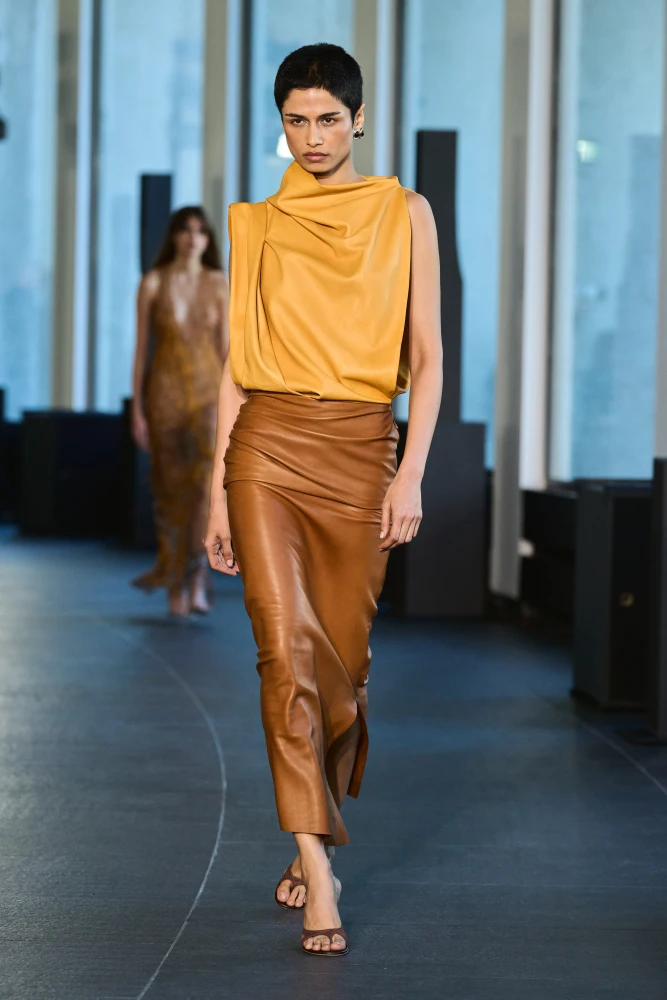 Christopher Esber використовує в образі жовтий драпірований топ із коричневими брюками і взуттям. Burberry поєднує жовту парку з коричневим в’язаним топом і мікрошортами, а на подіумі Tod’s коричнева група з жакета, сумки та взуття комбінується з жовто-гарячою сорочкою.