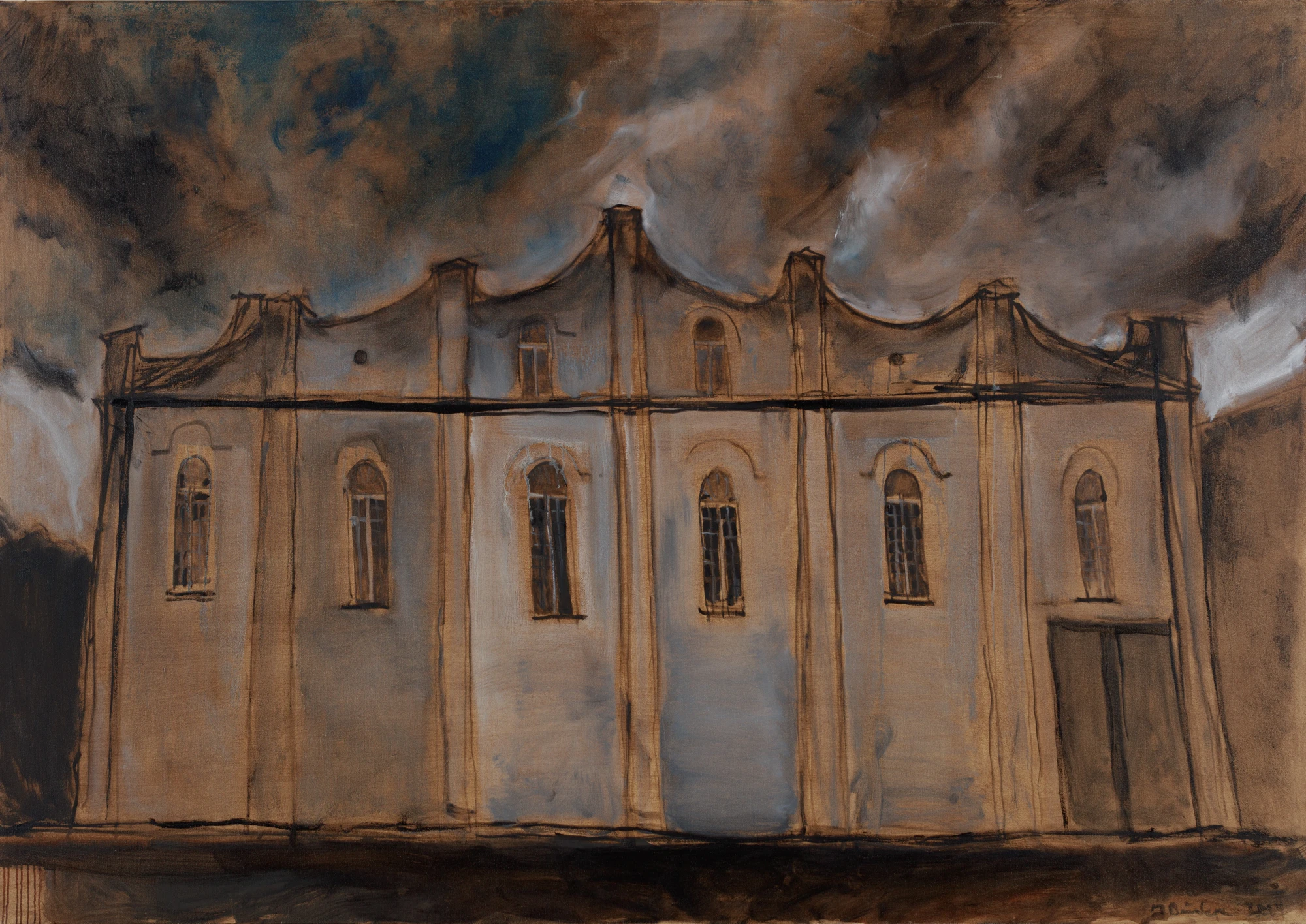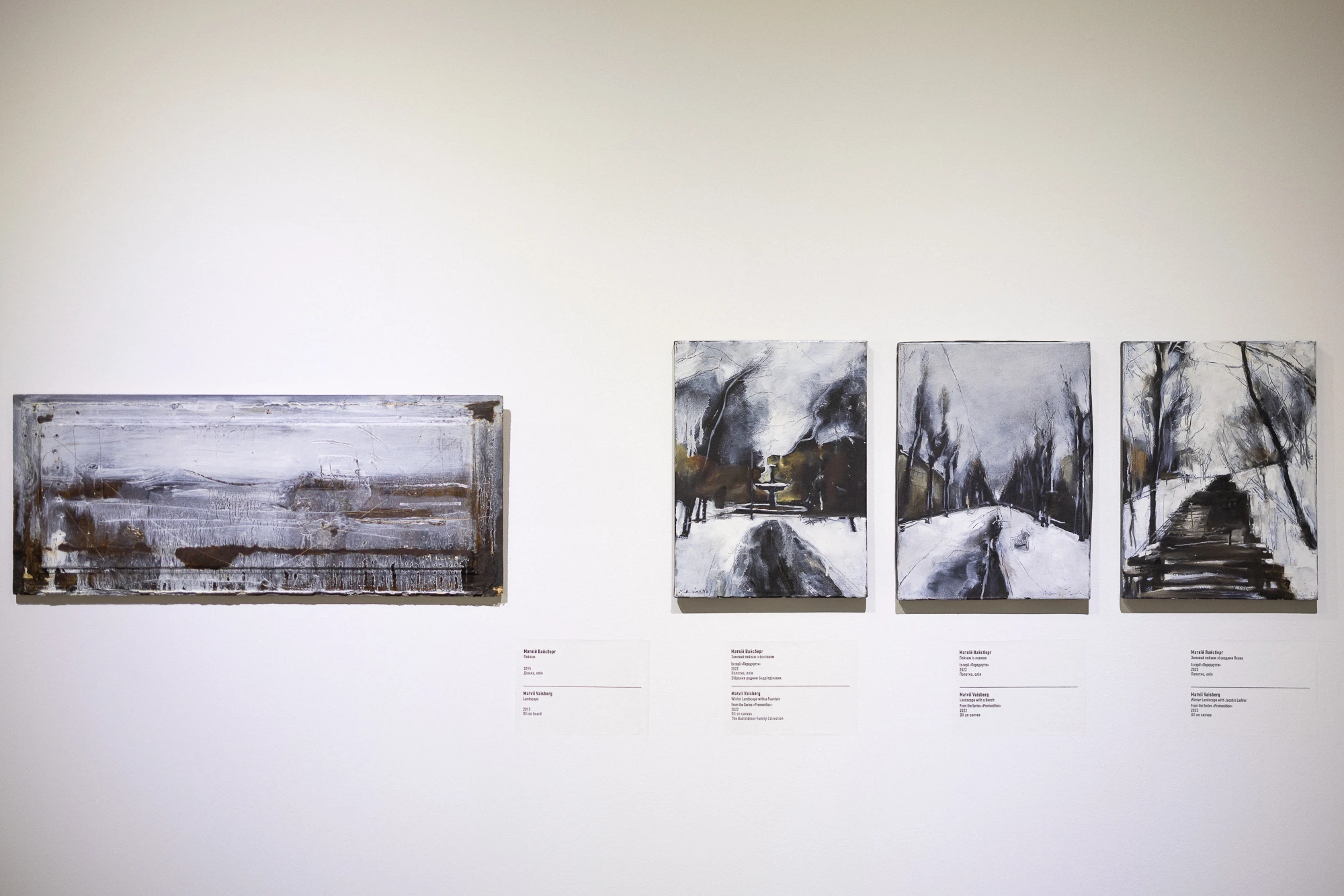 Тож більше я такої необхідності не маю, адже віднайшов у Києві те відчуття, якого мені не вистачало. Ліворуч на другому поверсі розміщена серія «Вікна», які я дуже люблю. Вікно – це готова картина в рамі, просто бери і зображуй. Далі ми знайомимося з серією робіт «Київське небо», серед яких є як давні, так і нові роботи, які дуже відрізняються. Ті картини, які створив раніше, я називаю «безпечальні». Нові ж роботи зовсім інші. Єврейські мудреці казали: «Небеса завжди мовчать», але ми знаємо, що зараз небо навіть фізично не мовчить. І з одного боку, я люблю блакить і хмаринки, а з іншого боку, відчуття теперішньої тривоги нікуди не подінеш, тож воно відчувається на цих картинах. Далі глядач може побачити серію «Караван». Це історія, як я поїхав до Одеси вже під час повномасштабної війни. Я ходив і дивився на зачинені пляжі і думав, що не можу це написати. А ж раптом побачив на горизонті кораблі, наче розсип перлин. І вся драматургія змінилася. А що далі було в цій історії? А далі було те, що це наше море, наше зерно на наших кораблях. І ніхто не відміняв цю блакить і красу довкола. До речі, серію «Караван» я продовжую.