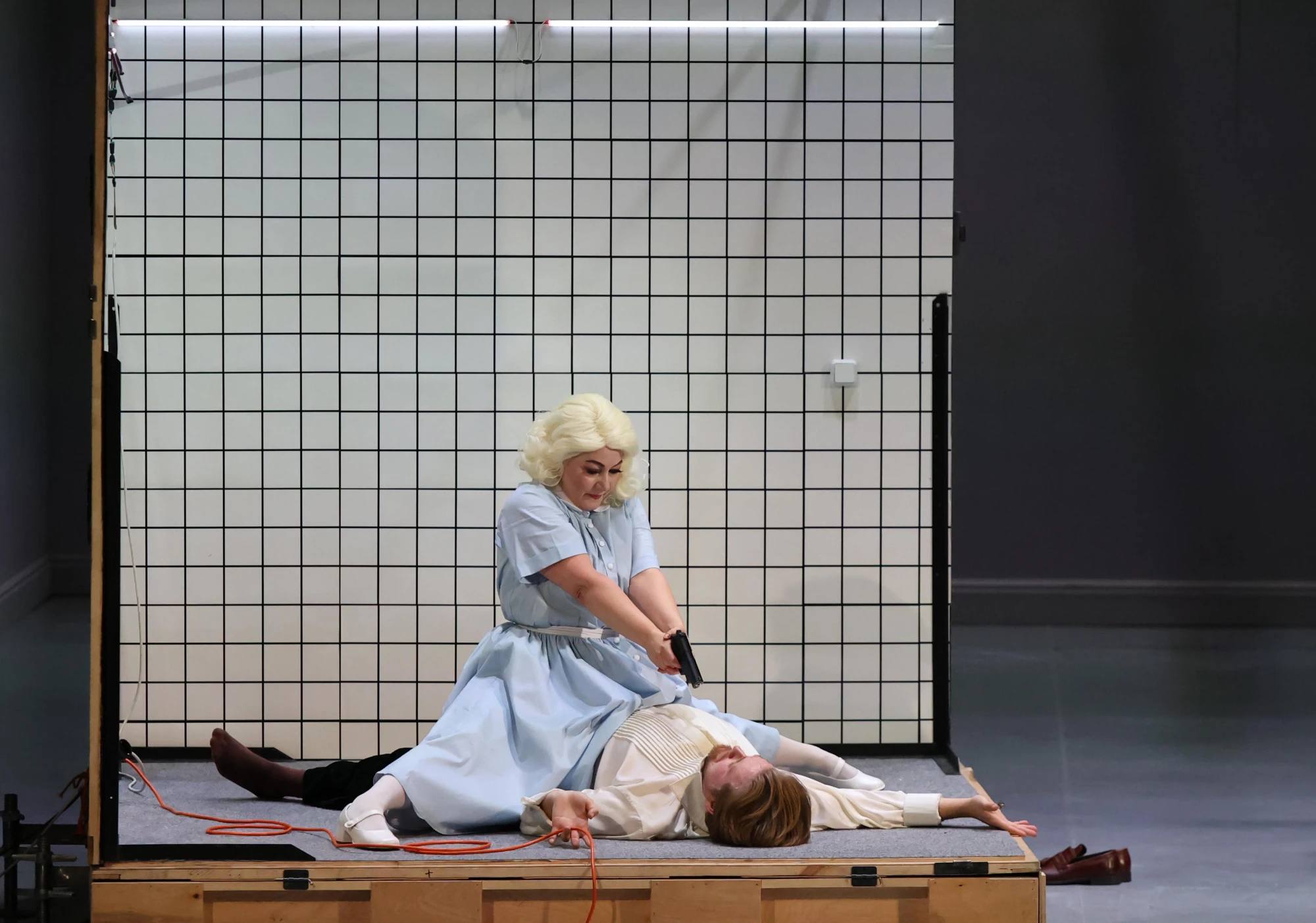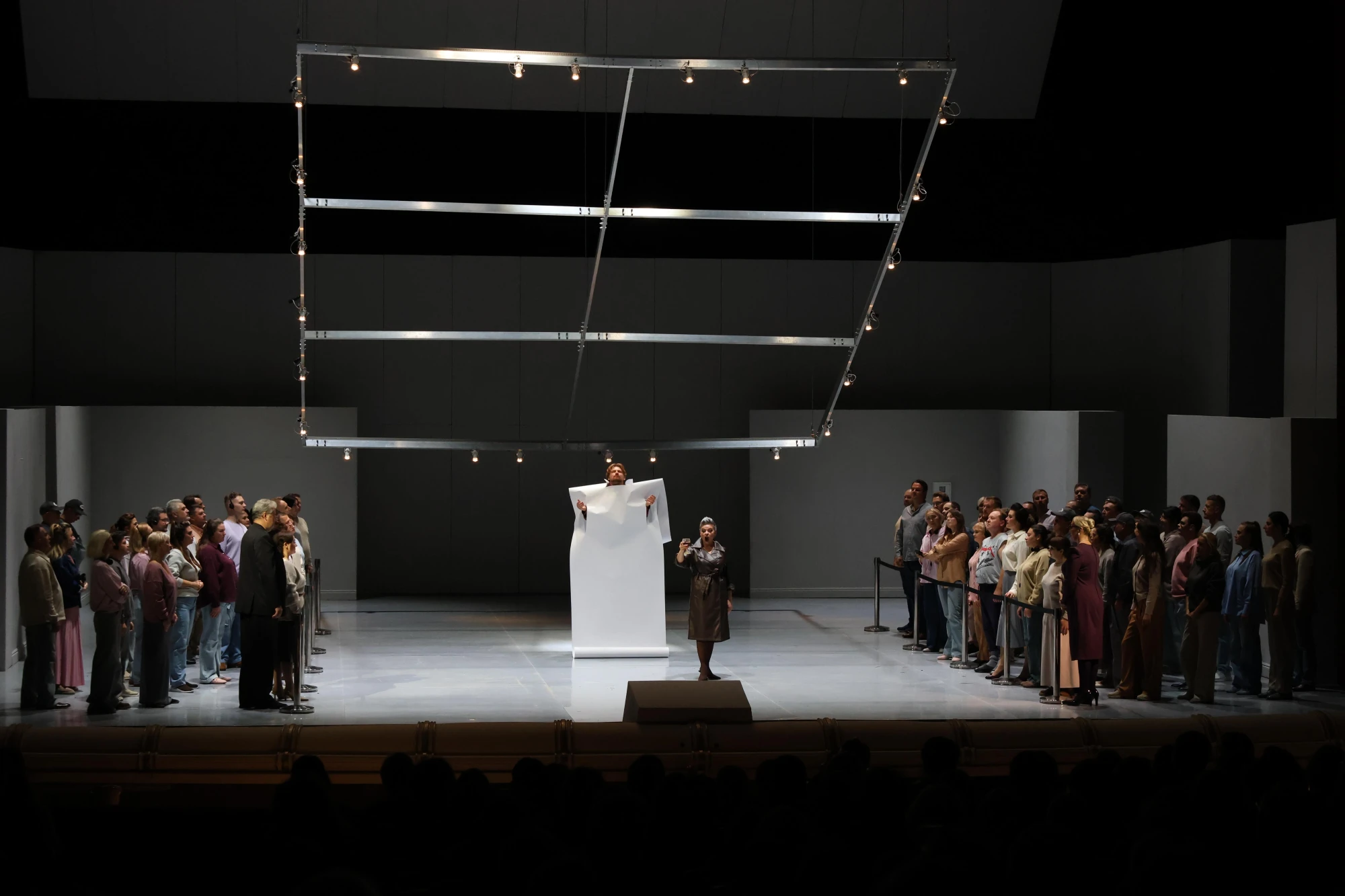 У вашій постановці дія переноситься до музею сучасного мистецтва, і таким чином виникає новий вимір. Хор спостерігає за головними героями відсторонено, як глядачі, що прийшли на виставку. А ми із зали своєю чергою дивимося на них як на «ожилий музейний простір». Як би ви прокоментували це сценічне рішення?