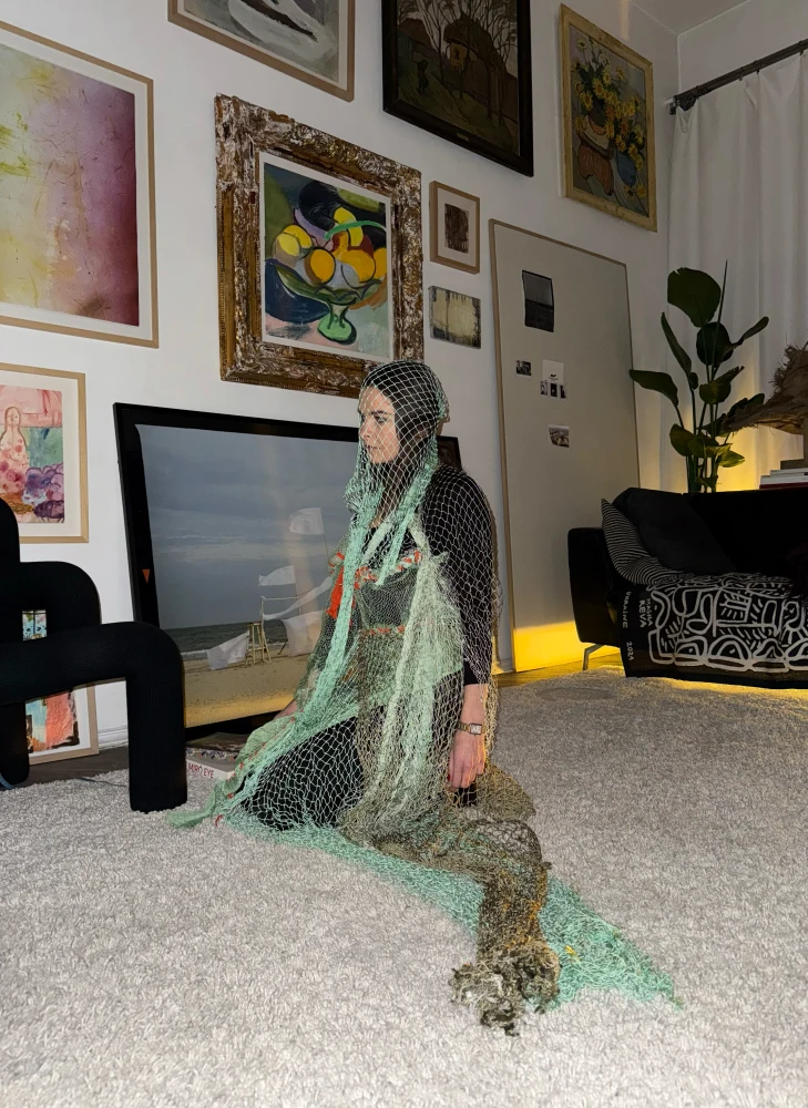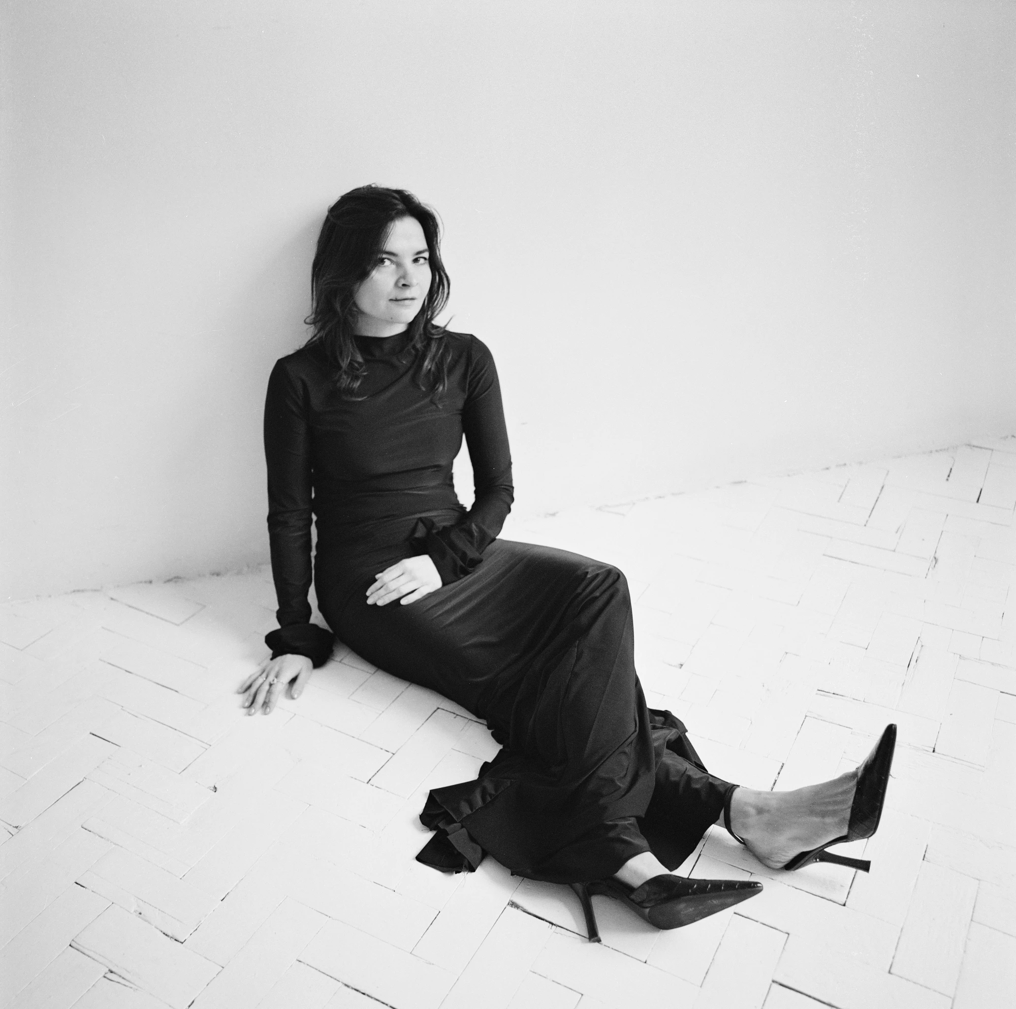 Я зараз знаходжуся на етапі, коли моя візуальна комунікація і є основним джерелом мого спілкування зі світом. Тож я подумала, що, якщо не показую ці роботи в середовищі галереї, може бути такий дивний формат портрета. В мене є така практика: я шию собі сукні, здебільшого коли мій стан змінюється і зʼявляється бажання створити собі нову «оболонку». Може, як захист, а, можливо, як ілюстрацію стану. В цьому випадку я досліджувала злість і мені стало цікаво: а що буде, якщо я поєднаю цей свій ритуал зі створенням одягу, але щоб він проілюстрував мою ідею та стан. Сукня чорна, тому що це колір усіх кольорів, абсолют — він наче оптичний ефект, який вказує на живіт, де зароджується і злість, і любов. Ще тут присутнє відчуття мого тіла: я більше не соромлюся його, а навпаки, люблю всі його вигини, які ця сукня обтягує. Я сприймаю цей топ і спідницю як одне ціле, тому називаю сукнею.