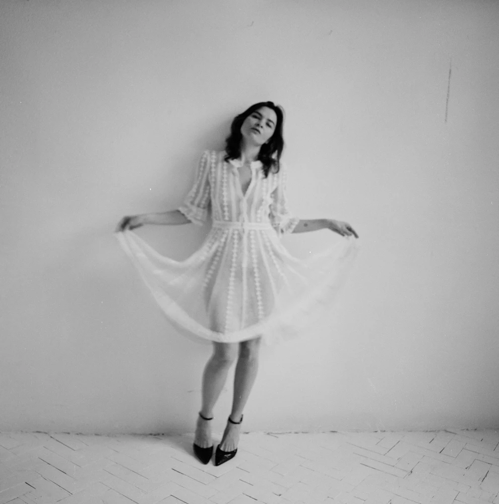 Це автобіографічна робота про прийняття власної жіночності попри довгі торги із собою, комплекси та пережите насильство. Тут присутня самоіронія, адже це і захисний механізм, і якість візуальної мови, якою я спілкуюся, — мої реальні почуття можуть бути важкими, тому спідниця і виглядає ніби куліси театру. Фокус на нижній половині тіла. Я фіксую піковий момент насолоди, яка була б неможлива без пізнання власної сексуальності як перемоги над комплексами.