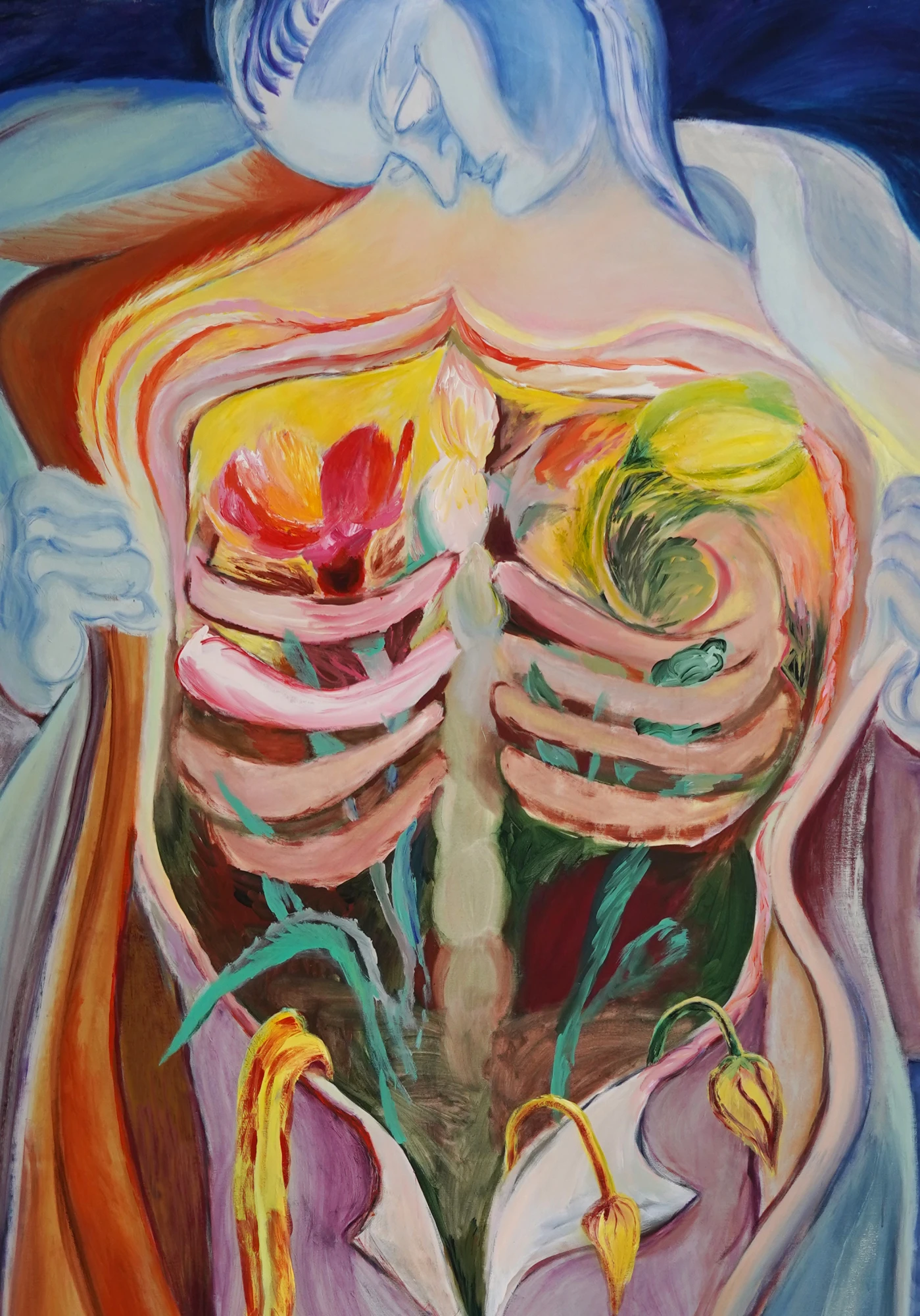 Маша хотіла взяти до експозиції іншу мою фотороботу 2016 року, де я працювала з тілами моделей. Я розповіла їй про цей живопис, і було очевидно, що це більш актуально і відверто. Я дуже вдячна, що вона мене зрозуміла і підтримала. На мою думку, тема актуальна ще й тому, що ми зараз масово переживаємо насильство, спричинене війною. І кожному з нас треба навчитися по-своєму цю травму усвідомлювати та перемагати врешті-решт.