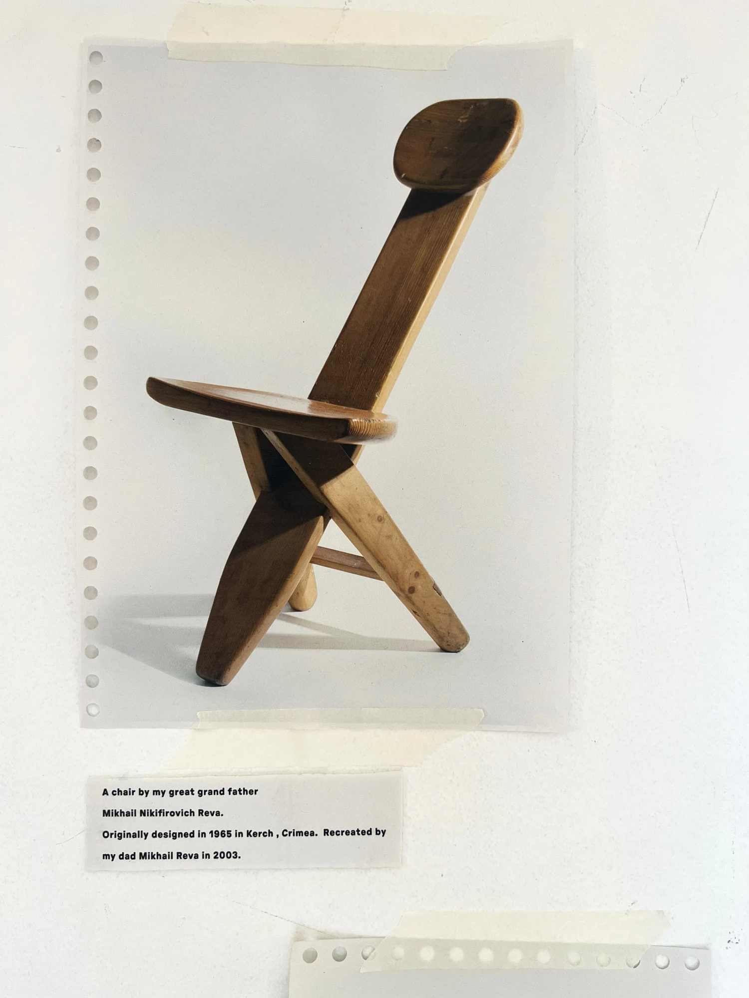 Мені дуже подобається робити щось функціональне, і це насправді сімейне. В нашій родині є стілець, який розробив мій прадідусь з Криму, — я мрію випустити його в тираж. Мій дідусь був самоучкою, він створював різні дивні речі, а мій тато (скульптор Михайло Рева. — Ред.) відтворив цей стілець за ескізами, і зараз він стоїть у його майстерні в Одесі.