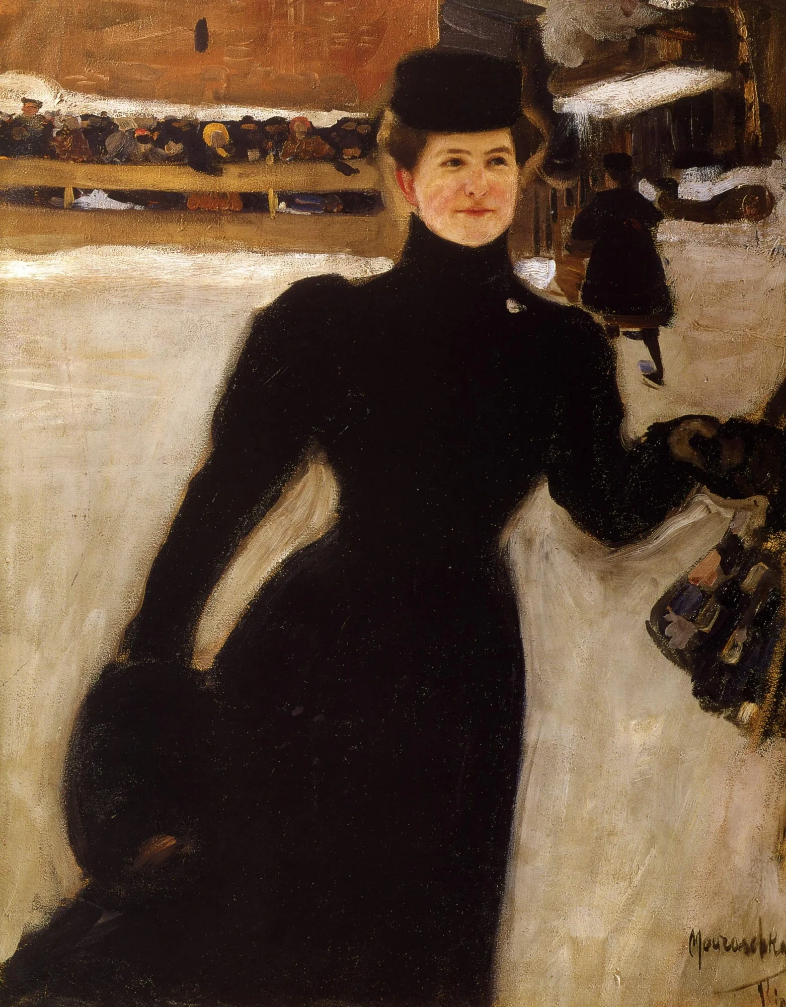 Пані на картині виглядає так, ніби щойно вийшла з модного огляду — але ще до того, як мода стала індустрією. Вона вдягнена за останніми трендами зимової моди. На ній класичне пальто. Його рукава прикрашені буфами — це був короткостроковий тренд, вже 1915 року жіночий силует приймає стримані обриси, позбувається додаткових об’ємних елементів.