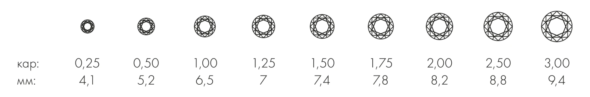 Каратність показує вагу діаманта, а не його візуальний розмір. Камені з однаковими показниками можуть мати різний вигляд — усе залежить від огранювання, форми та пропорцій.