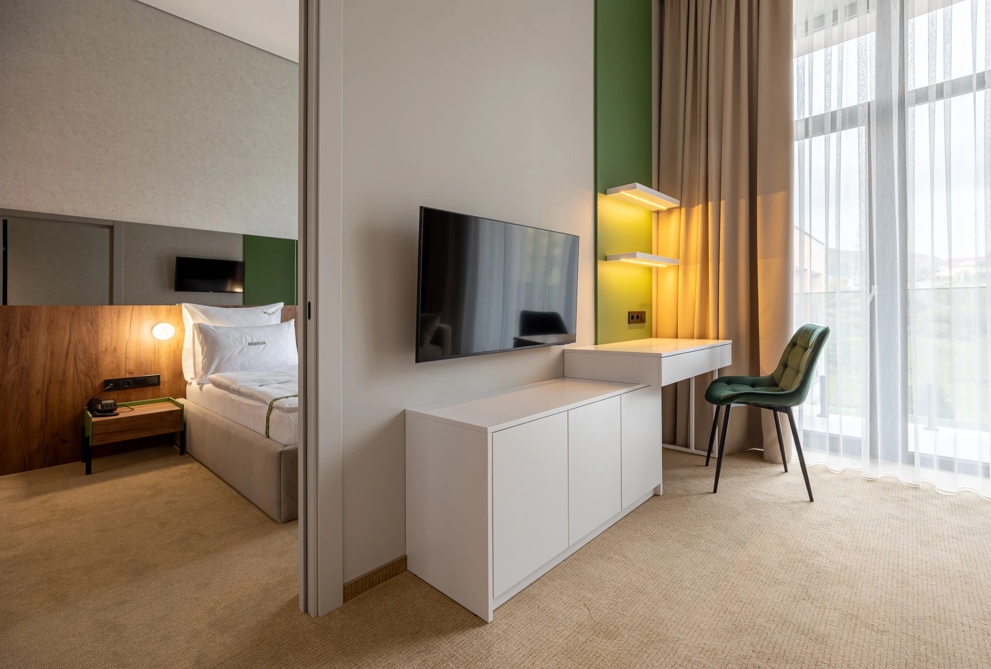 Відкривши двері до WOL Green Polyana, ви потрапляєте у простір, де кожна деталь продумана, щоби створити відчуття справжнього дому. Тут немає випадкових штрихів — усе, від розташування розеток до м'якого світла ламп, впливає на ваше відчуття гармонії. 104 апартаменти, від компактних до розкішних люксів із мінікухнями, зручними робочими зонами та Smart TV — тут є все, що потрібно для комфорту та відновлення. Проте, головна перевага цього місця — це можливість адаптувати кожен апартамент під себе. Вибір постільної білизни, кольору подушок, температуру кімнати — усе це стає частиною вашої особистої гармонії. А якщо у вас є чотирилапий друг, не хвилюйтеся: йому тут теж знайдеться місце.