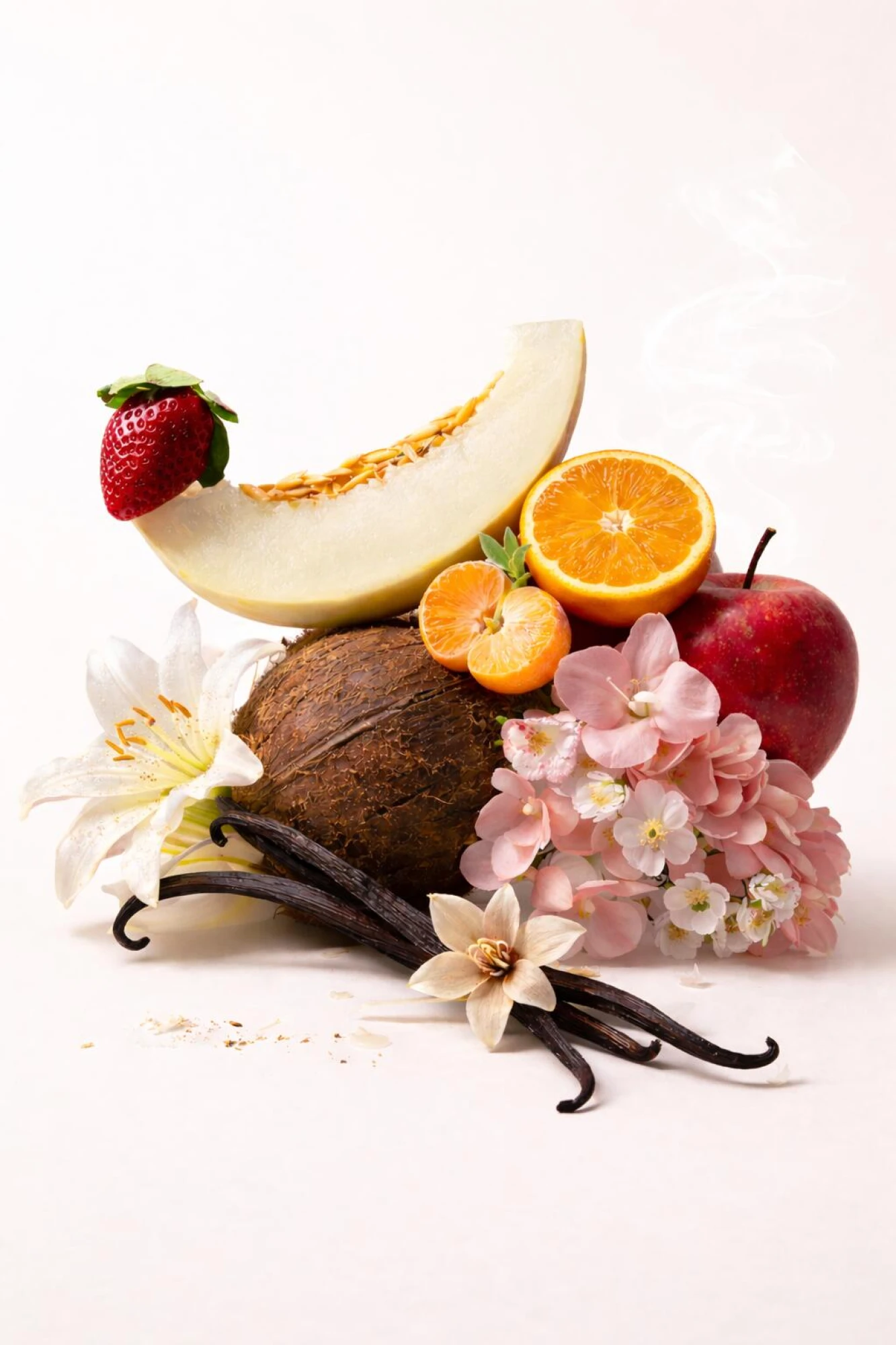 Верхні ноти: Аромат відкривається ефектом першого сонячного променя. Соковита диня та стигла полуниця, підкреслені іскристим бергамотом і мандарином, створюють настрій абсолютної безтурботності.