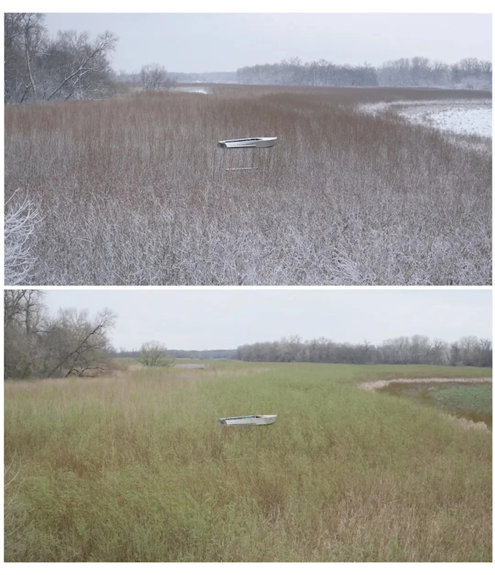 В основі інсталяції човен, що знаходиться на рівні води, однак тут він виступає статичним скульптурним об'єктом, вписаним у новий ландшафт — його оточує висока трава та дерева, які художниця зафіксувала у чотири різні пори року. Так художниця міркує про екологічну катастрофу та життя на території, яка залишається замінованою і все більше наближається до лінії фронту.