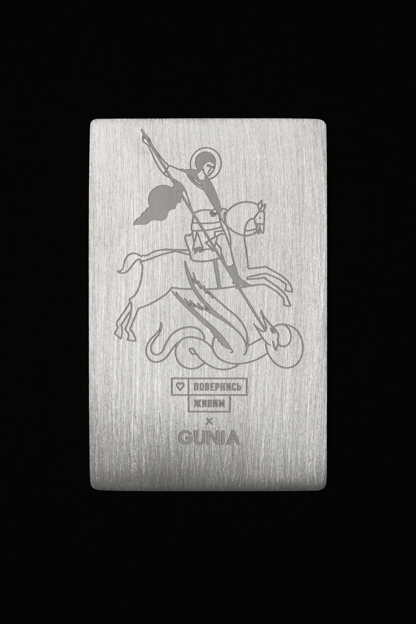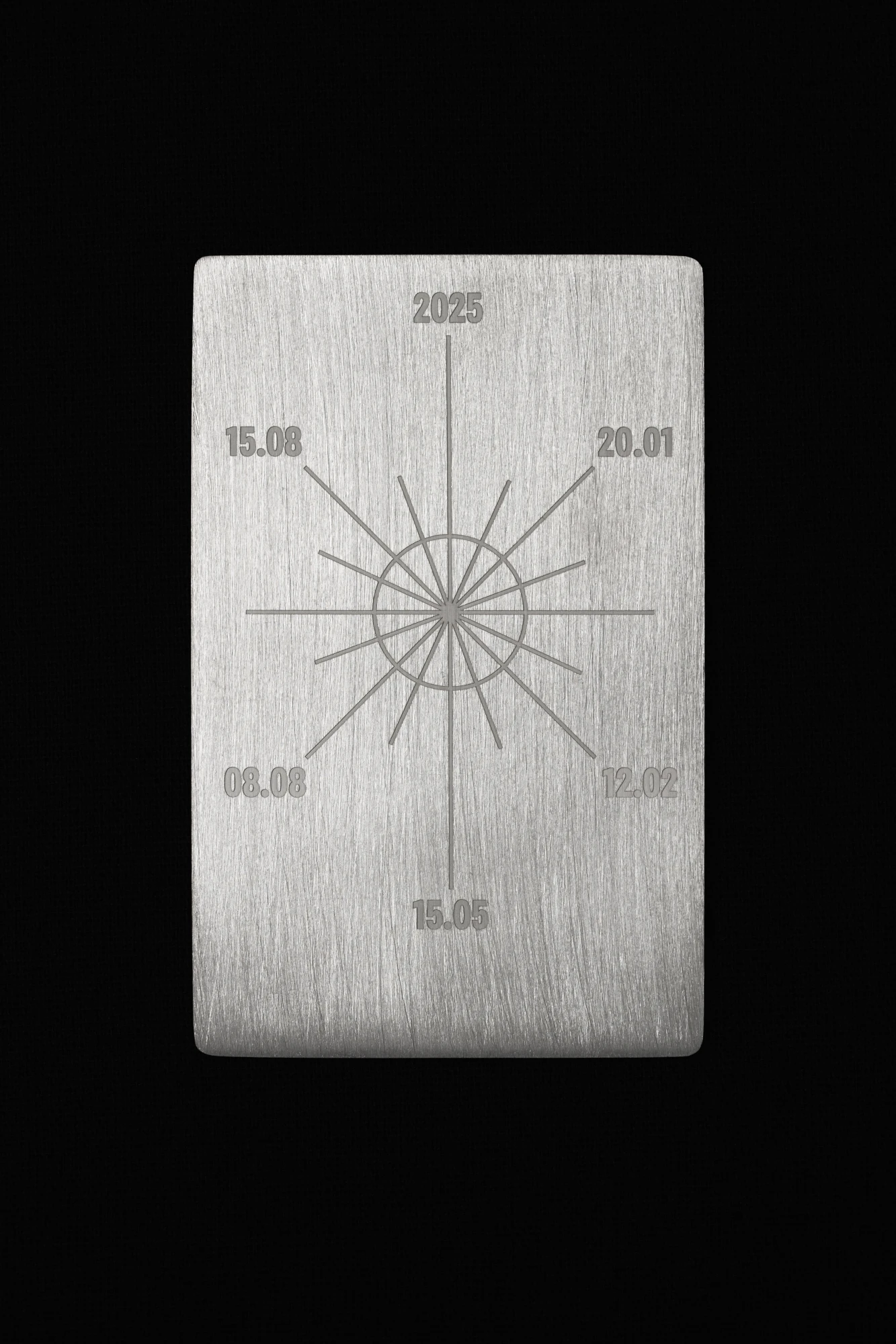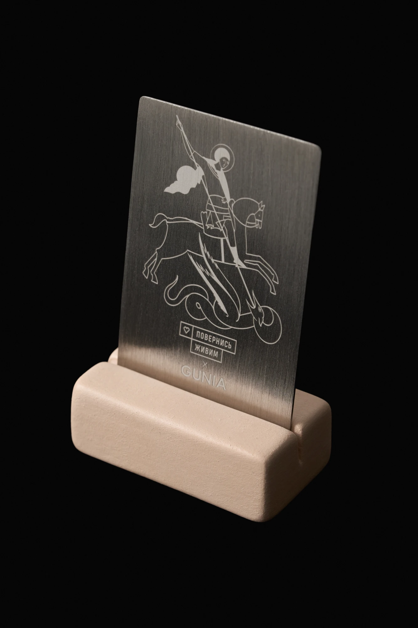 Календар має форму срібної пластини з гравіюванням з обох боків. На одній стороні — Юрій Змієборець, символ сили та гідності, що нагадує: перемога народжується через дію. Джерелом натхнення стала старовинна дошка з XVIII століття, на якій зображено Святого Юрія Змієборця з Львівщини — образ, що поєднує простоту та глибину, як пам’ять про народ, що вміє стояти за своє.