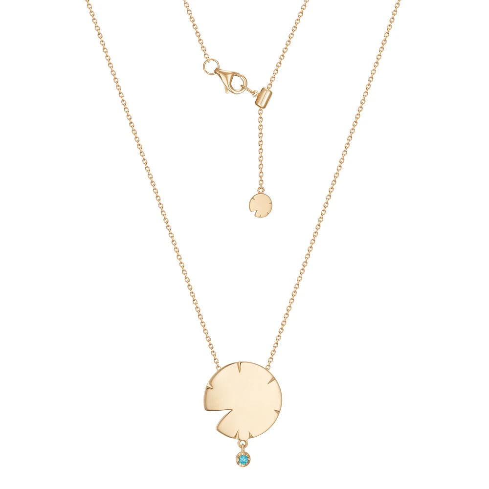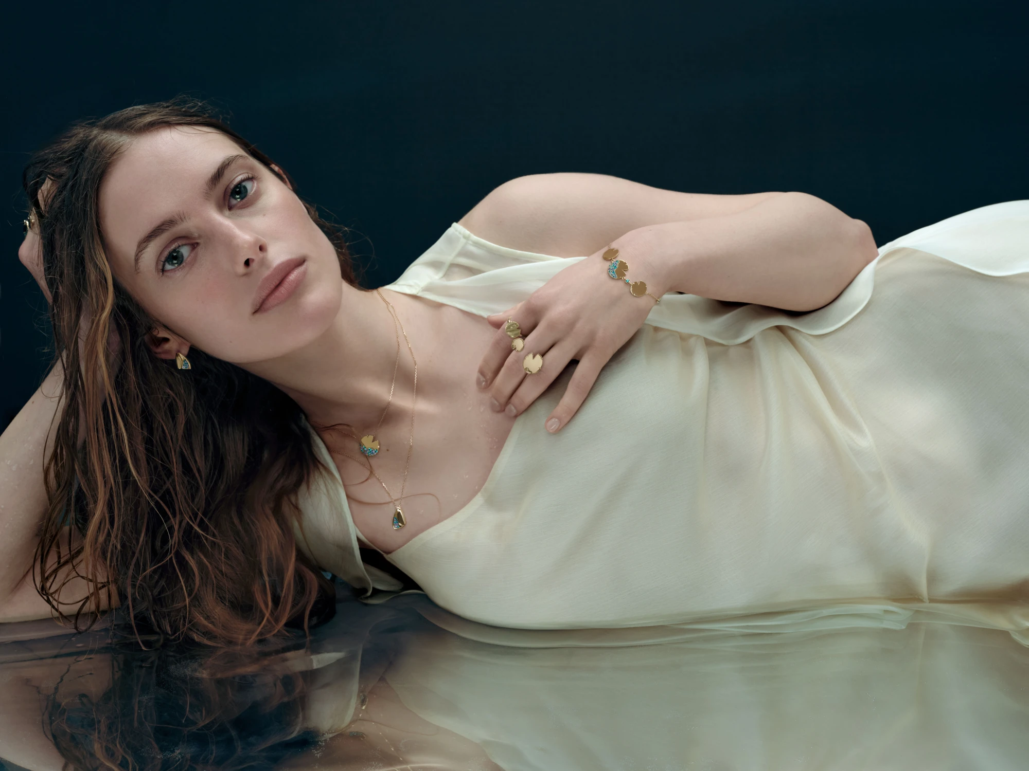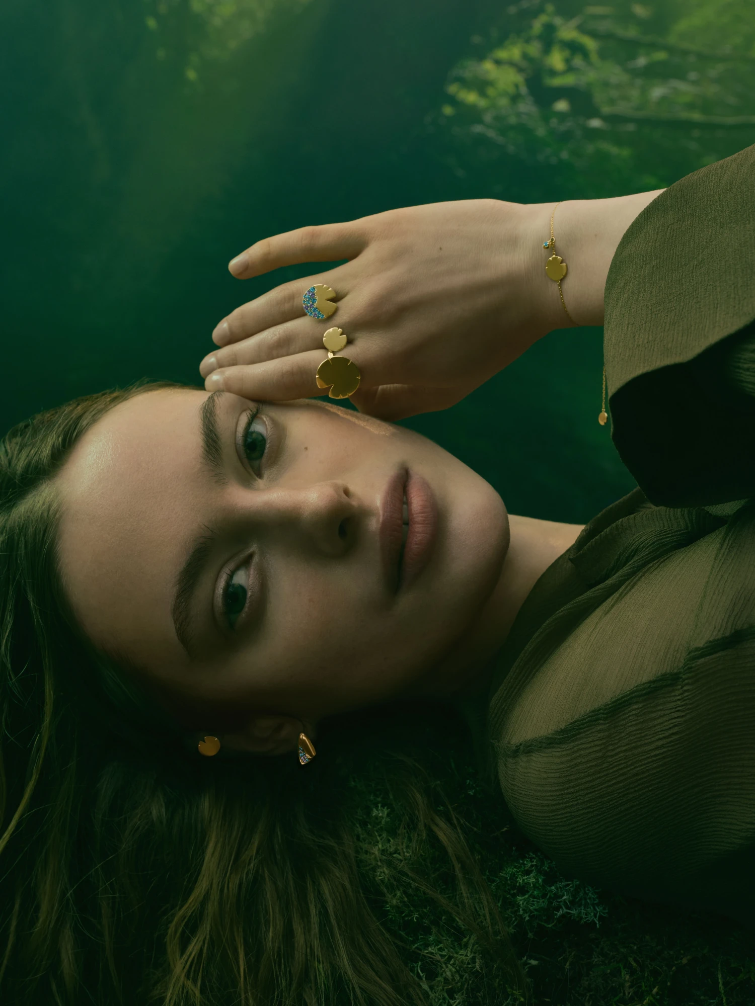 Прикраси виконані з жовтого золота та відтворюють м’яку, округлу форму пелюсток латаття. Цей мотив повторюється в різних розмірах у каблучках, моносережках, підвісах, кольє та браслетах. Частина прикрас має гладкий золотий фініш, інші оздоблені розсипом блакитних і бірюзових камінців, що створюють відчуття руху крапель та світла на поверхні води — так мерехтить Темне озеро, у глибині якого русалки й мавки творять свою магію.