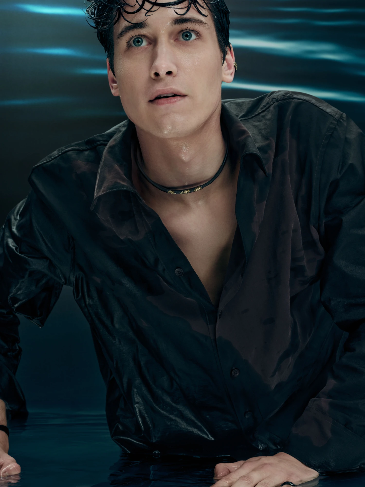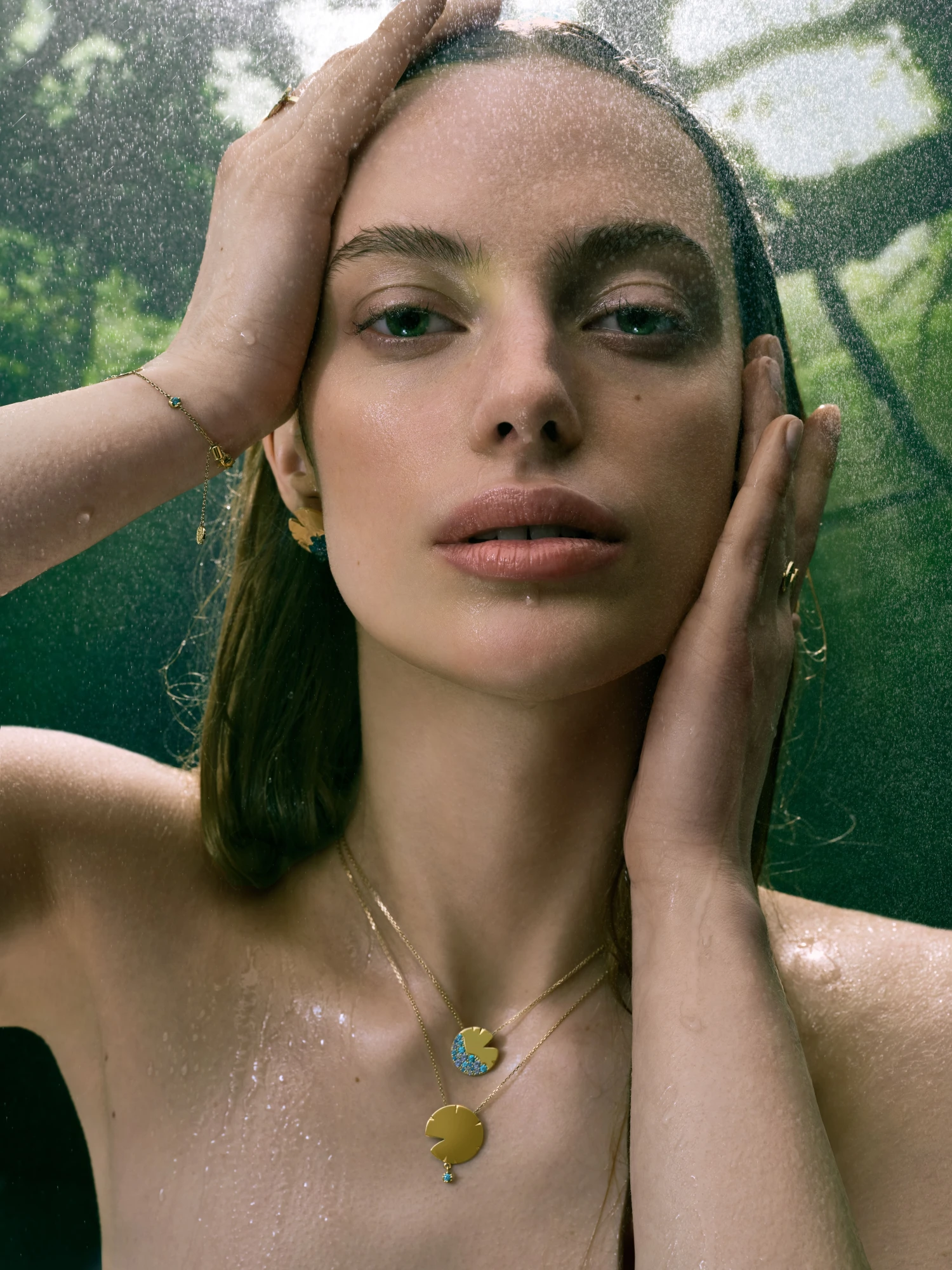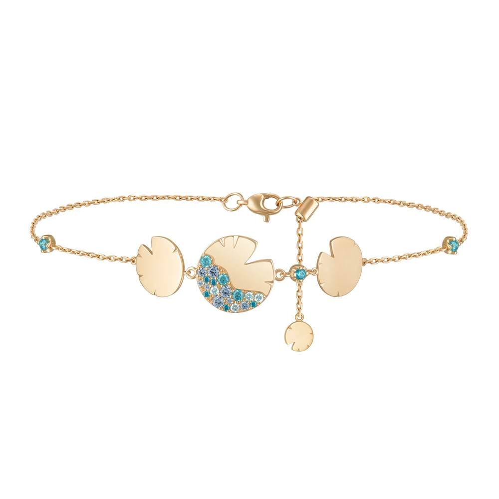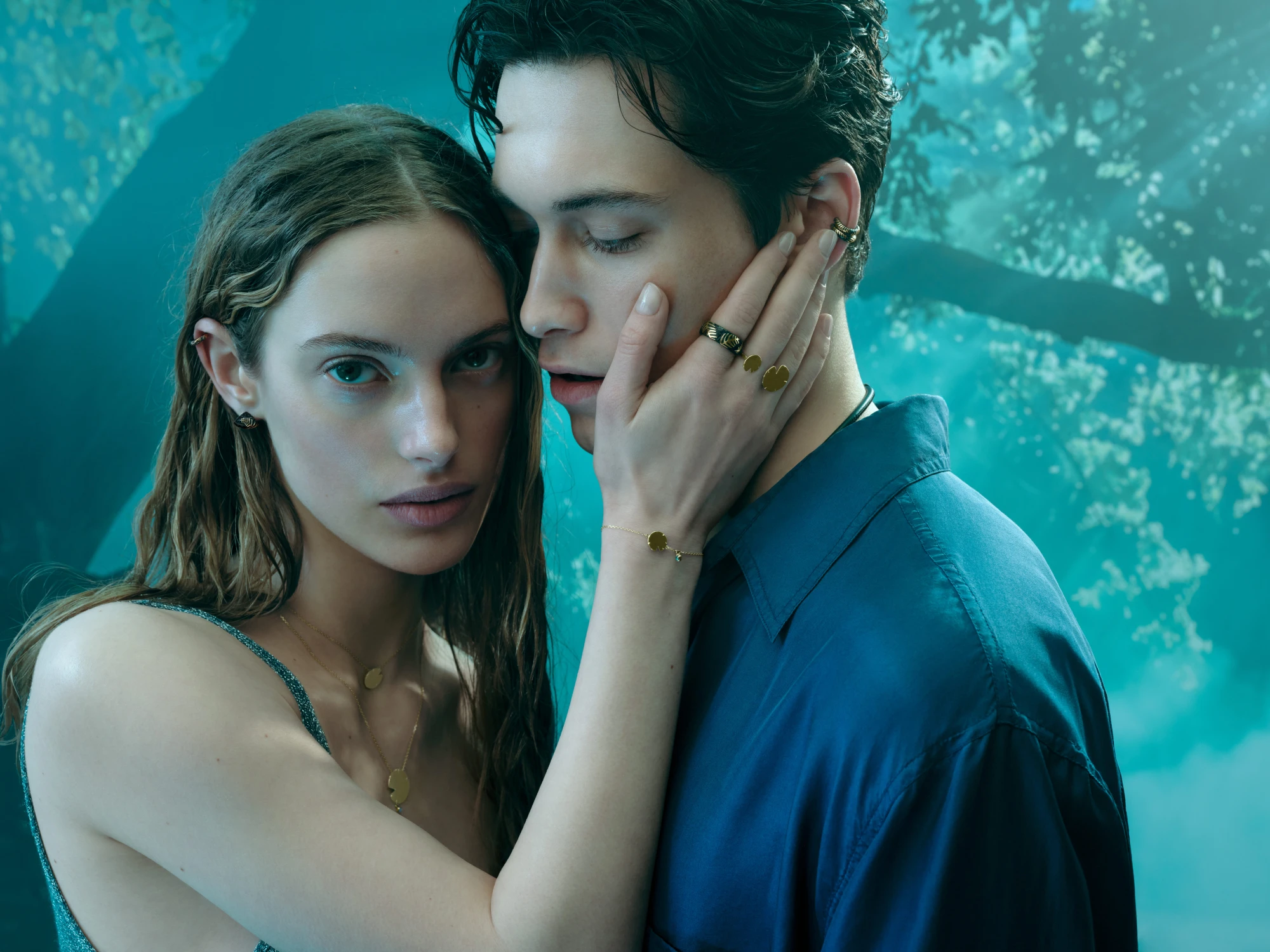 Прикраси виконані з жовтого золота та відтворюють м’яку, округлу форму пелюсток латаття. Цей мотив повторюється в різних розмірах у каблучках, моносережках, підвісах, кольє та браслетах. Частина прикрас має гладкий золотий фініш, інші оздоблені розсипом блакитних і бірюзових камінців, що створюють відчуття руху крапель та світла на поверхні води — так мерехтить Темне озеро, у глибині якого русалки й мавки творять свою магію.