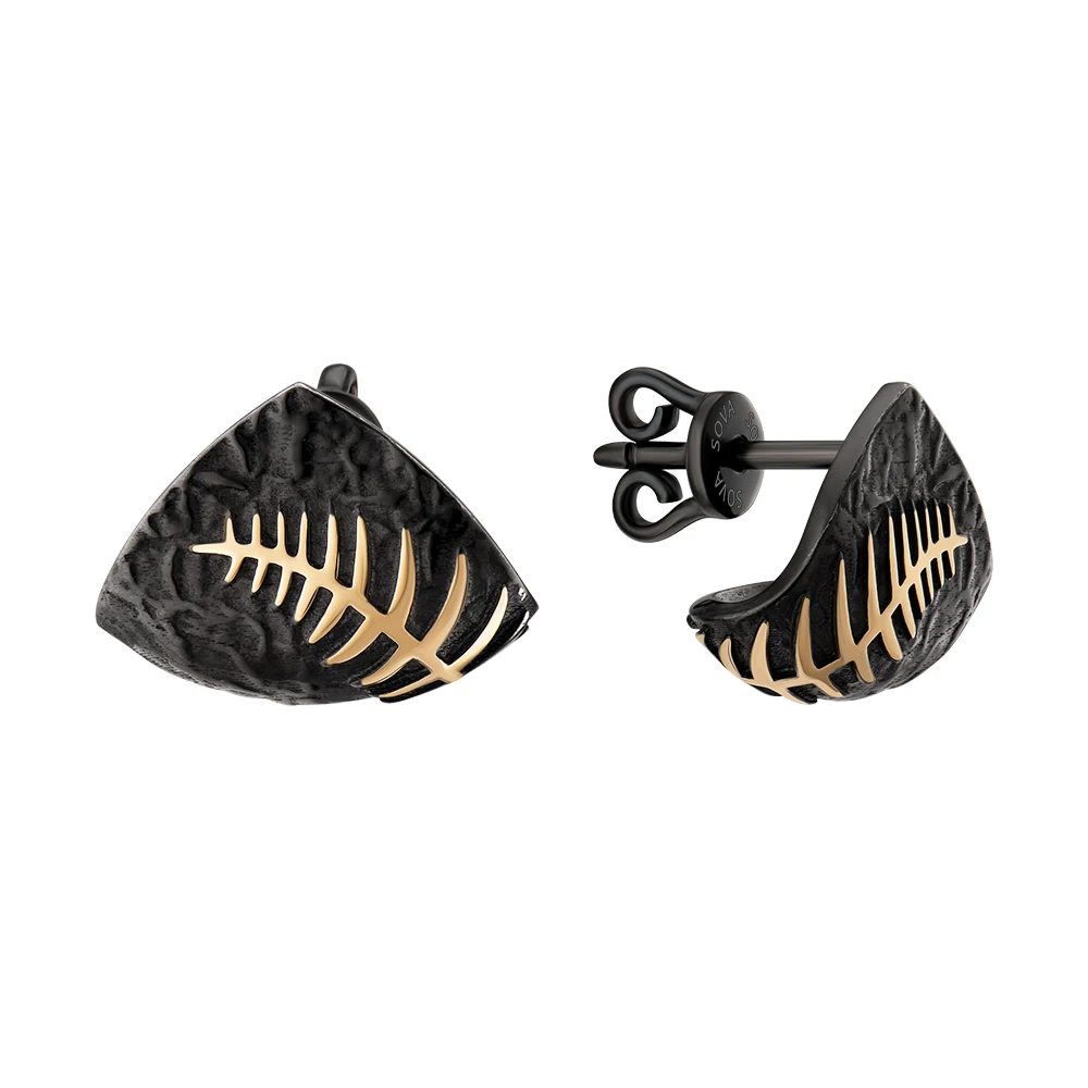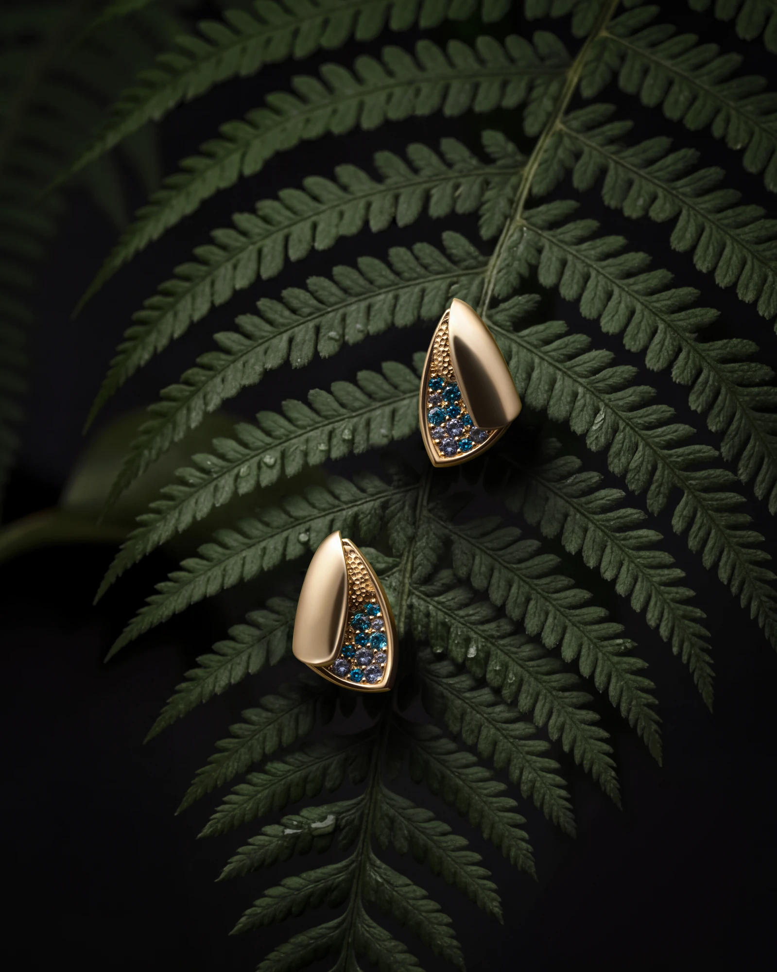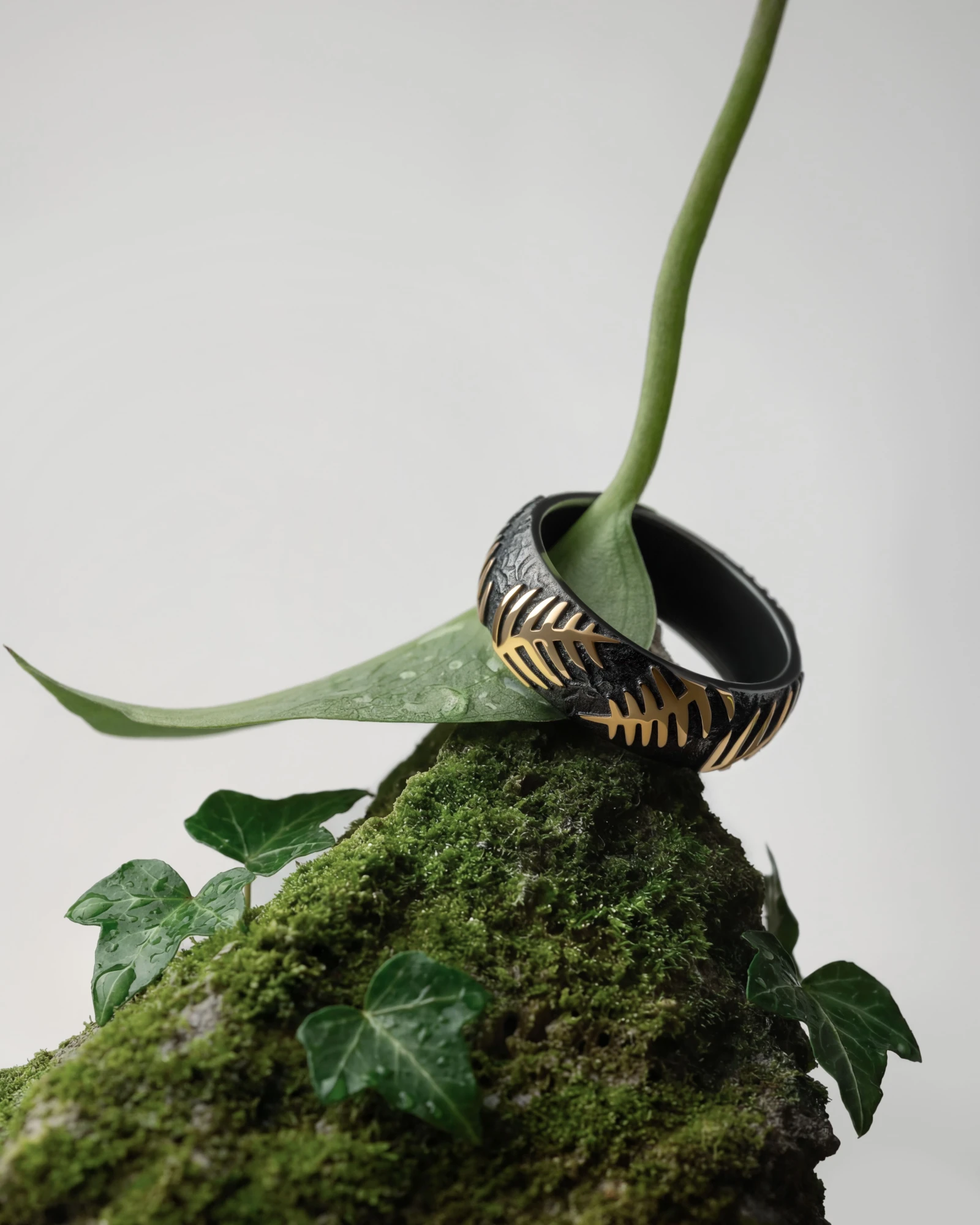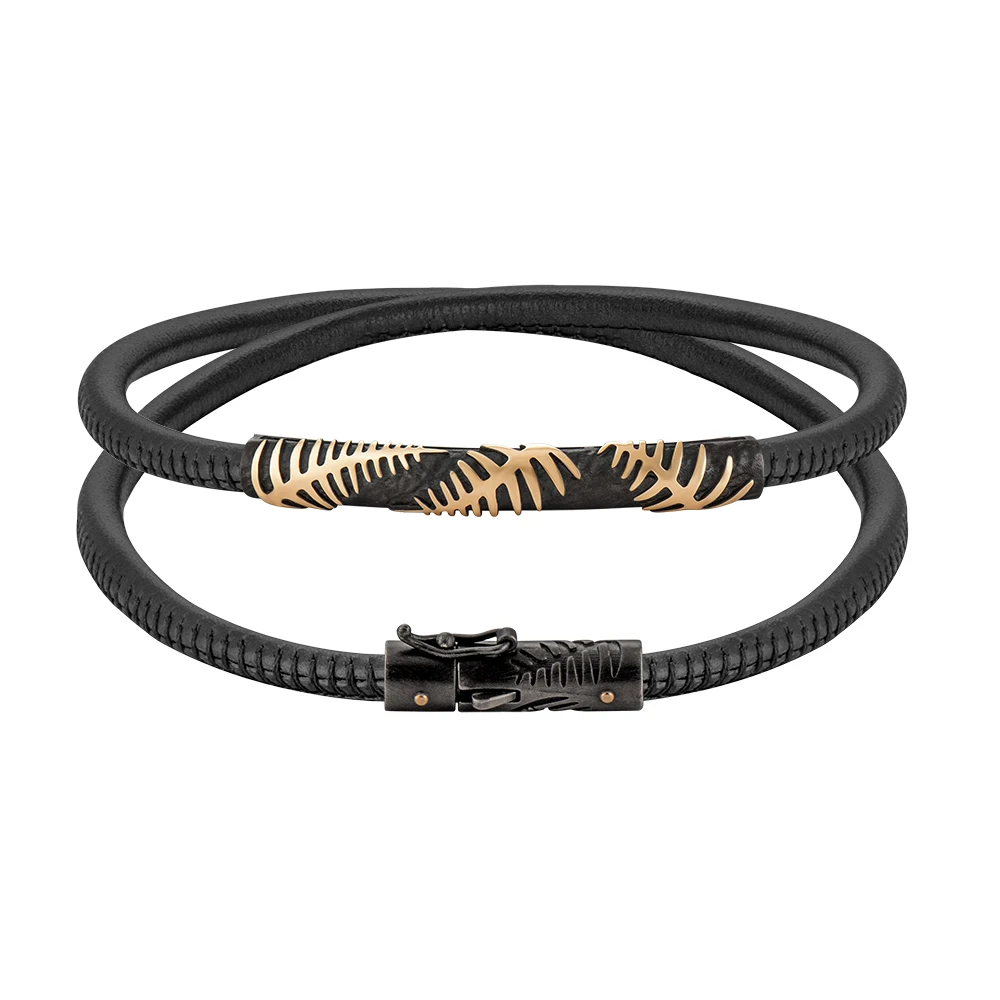 Золоте листя виступає на глибокому темному тлі з рельєфною текстурою. Цього ефекту ювеліри досягли завдяки покриттю золота рутенієм — воно створює відчуття глибини та підсилює контраст із жовтим металом, тому папороть здається об’ємною, ніби з’являється з темряви. У колекції це графічні унісекс-прикраси — кафи, сережки та чокер зі шкіряною основою, який можна стилізувати як браслет.