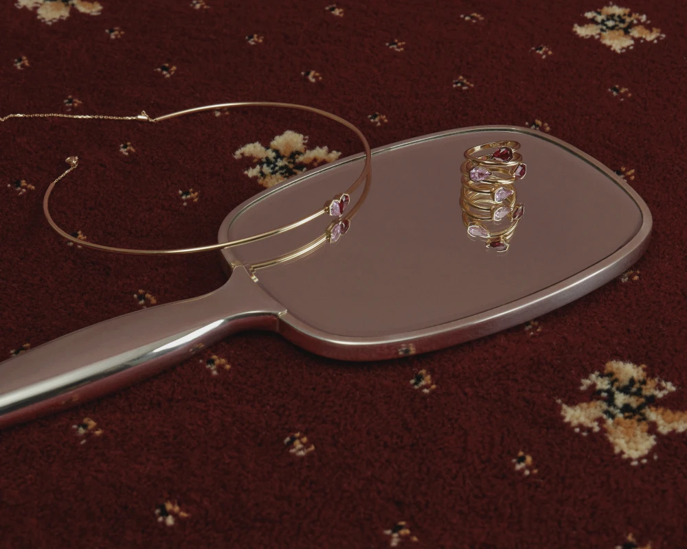 Особливість цієї колекції — використання лабораційно вирощених сапфірів, що відрізняються чистотою та глибиною кольору. Вони представлені у двох відтінках — Blush Rose і Cherry Red, що символізують різні аспекти закоханості: від тепла і ніжності до пристрасті та емоційної напруги.